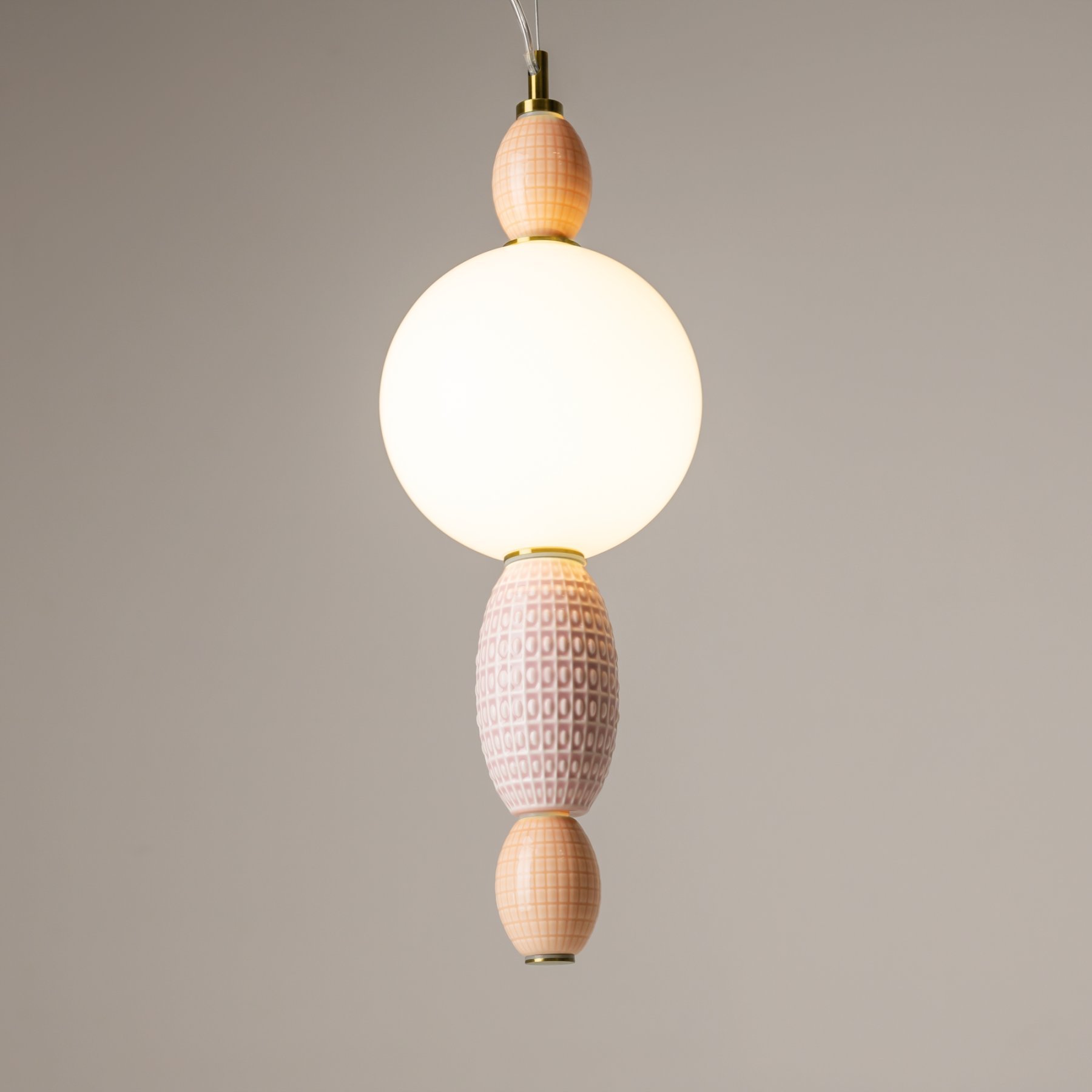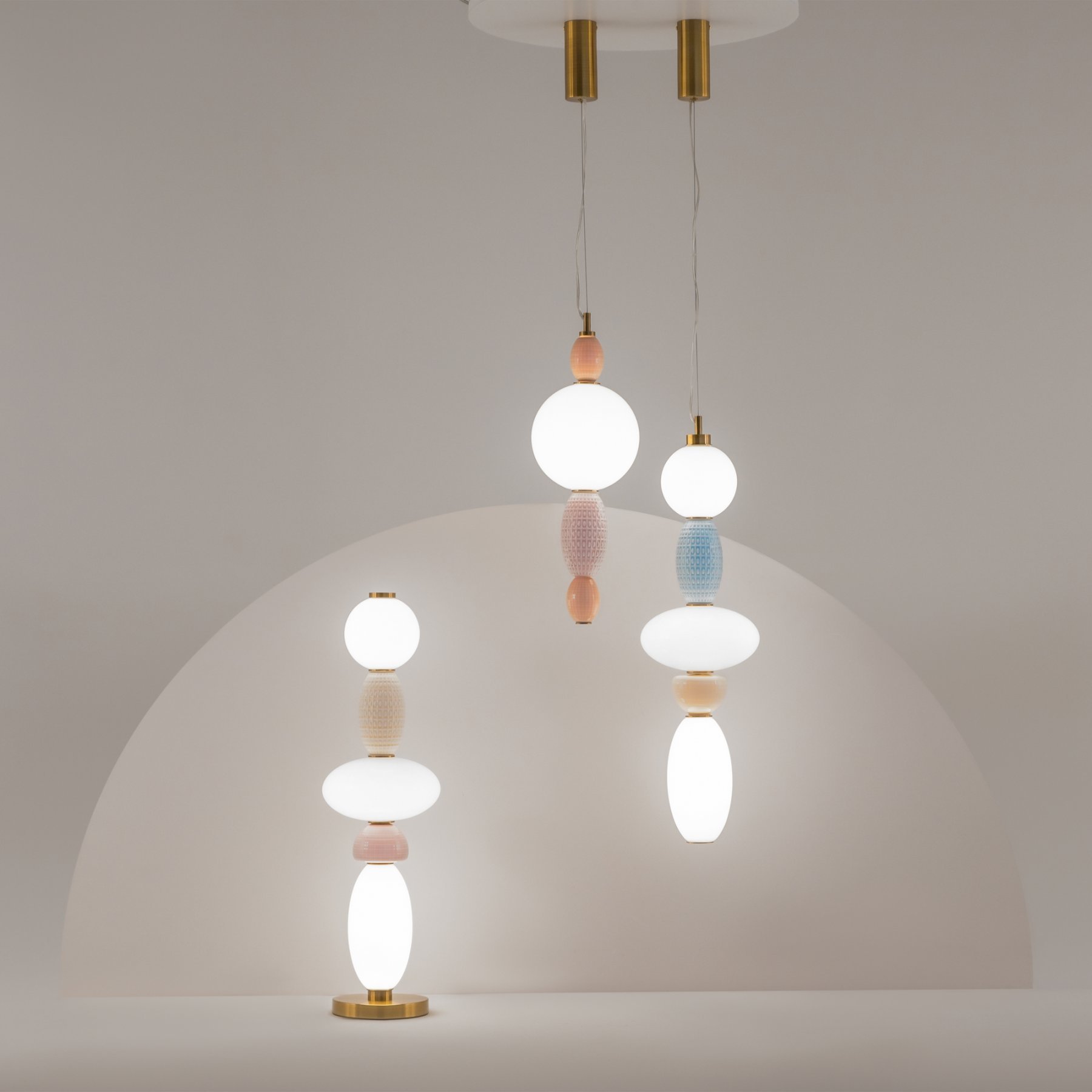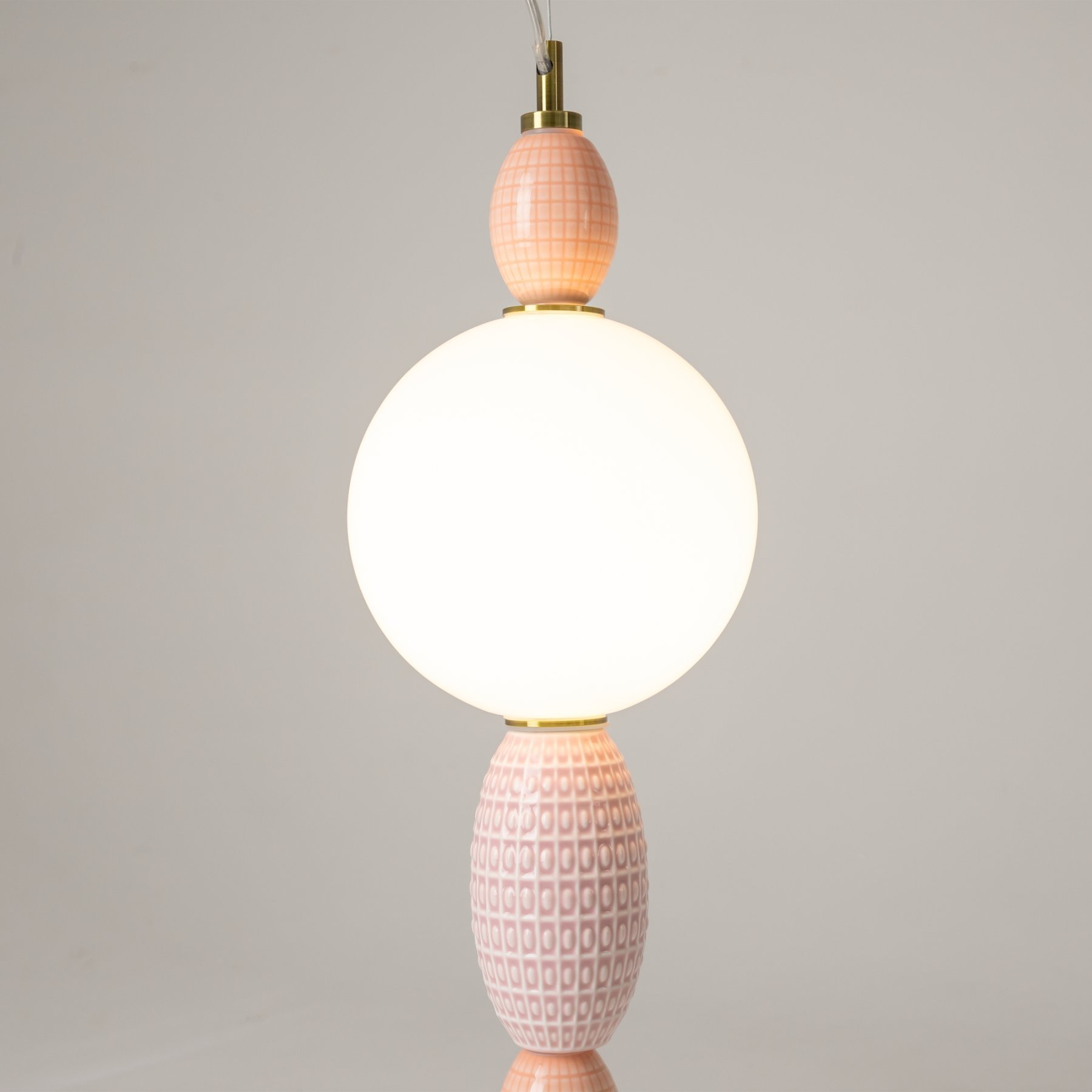 Металлическая арматура цвета латуни. Плафоны из белого стекла для мягкого, равномерного освещения, декоративные элементы из цветной керамики. Угол рассеивания 120°. Цветовая температура – 3000 К. Регулируемый провод длиной 3 м.