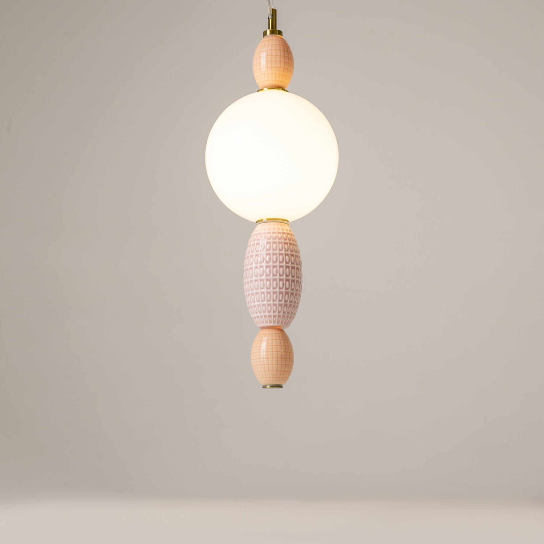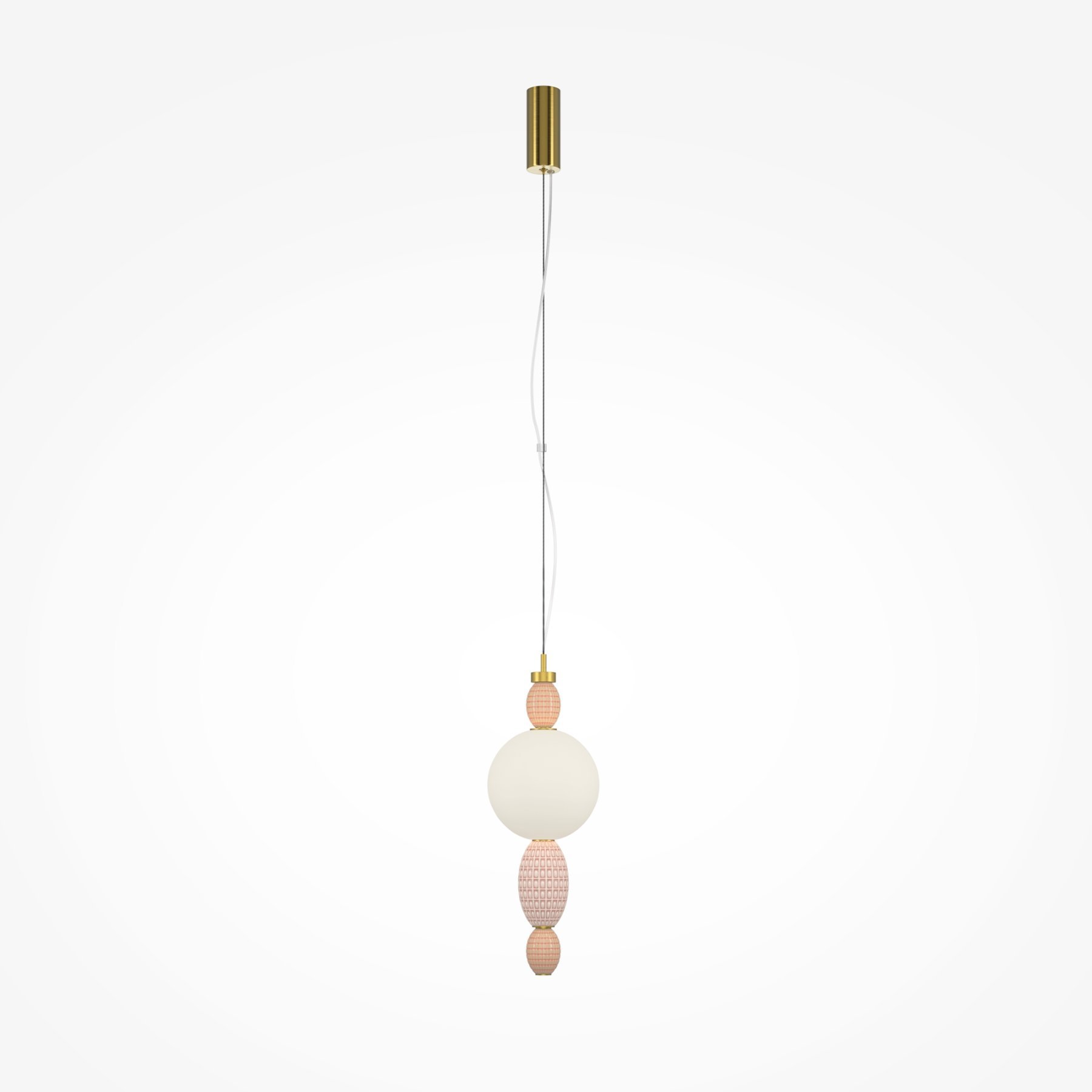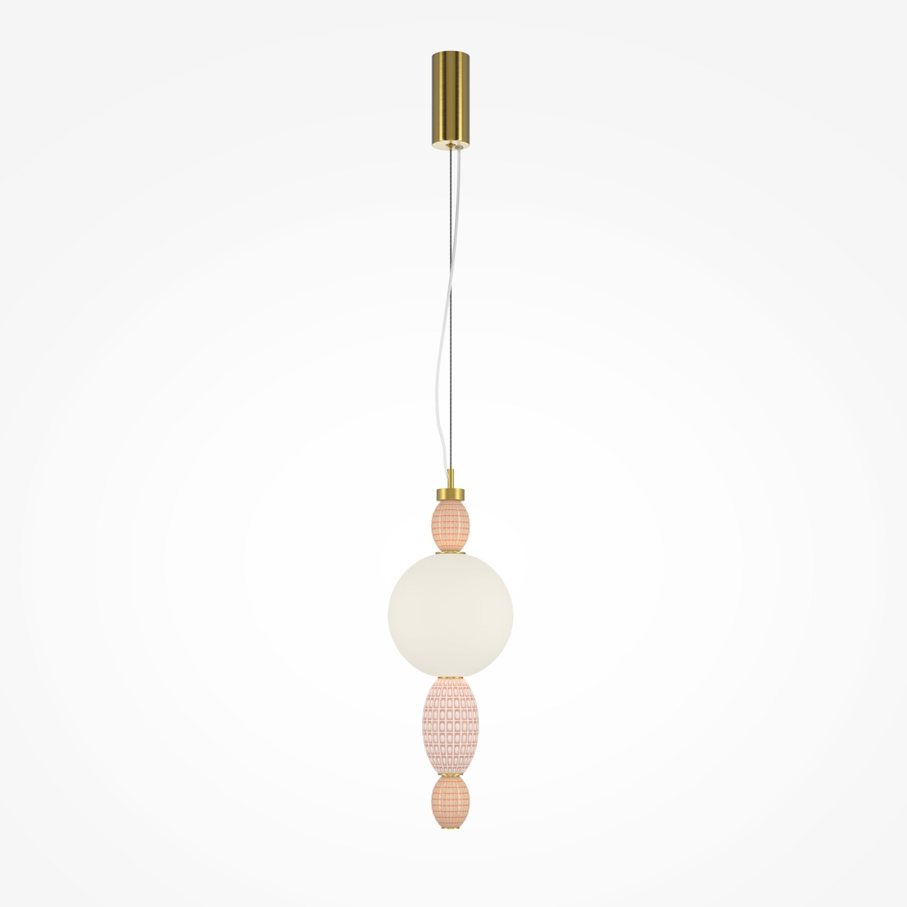 Металлическая арматура цвета латуни. Плафоны из белого стекла для мягкого, равномерного освещения, декоративные элементы из цветной керамики. Угол рассеивания 120°. Цветовая температура – 3000 К. Регулируемый провод длиной 3 м.