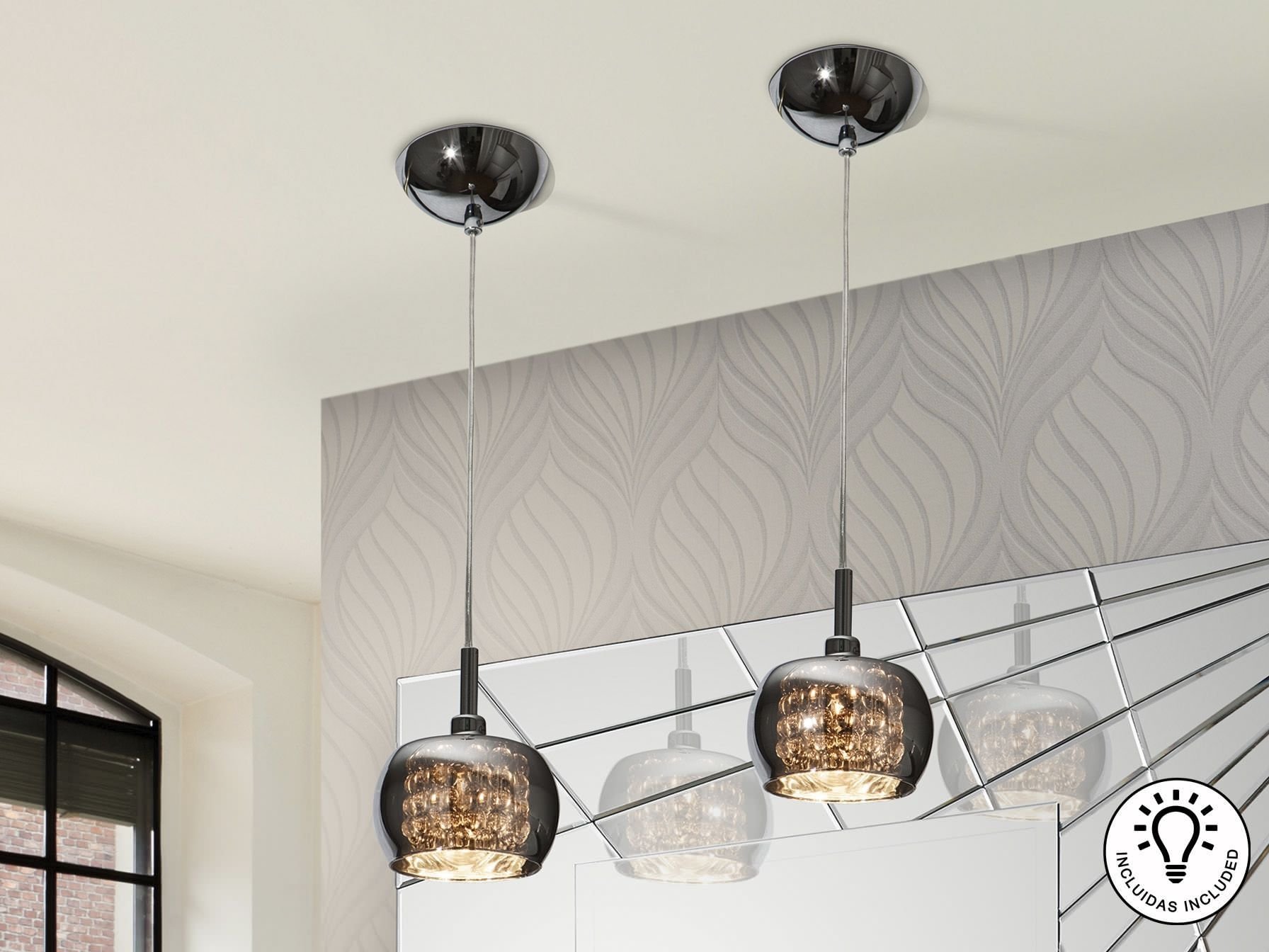 Подвесной светильник из стали с блестящим покрытием. Зеркальный стеклянный абажур с полосками стеклянных бусин внутри.