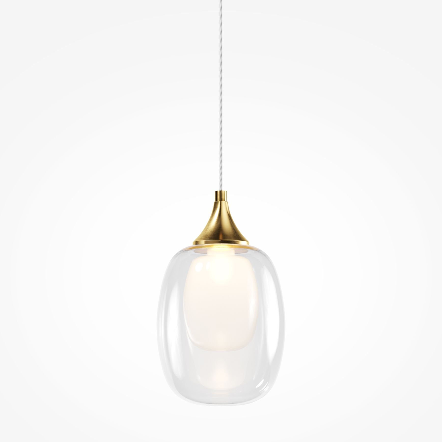 Металлическая арматура, цвет — латунь. Плафоны — двойное выдувное стекло. Внутренняя часть – матовая, внешняя – прозрачная. Элегантная неоклассика, трендовые округлые формы. Прозрачный провод длиной 3 метра подходит для помещений с высокими потолками. Регулируемая высота светильника для удобного размещения.