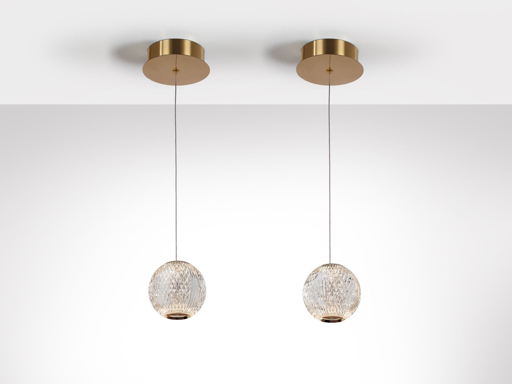 1-ламповый светодиодный светильник, металл с золотым покрытием. Сферическая линза Ø11 см из прозрачного оптического акрила, имитация хрусталя. Светодиод мощностью 6Вт. 3,200К. 272 лм.