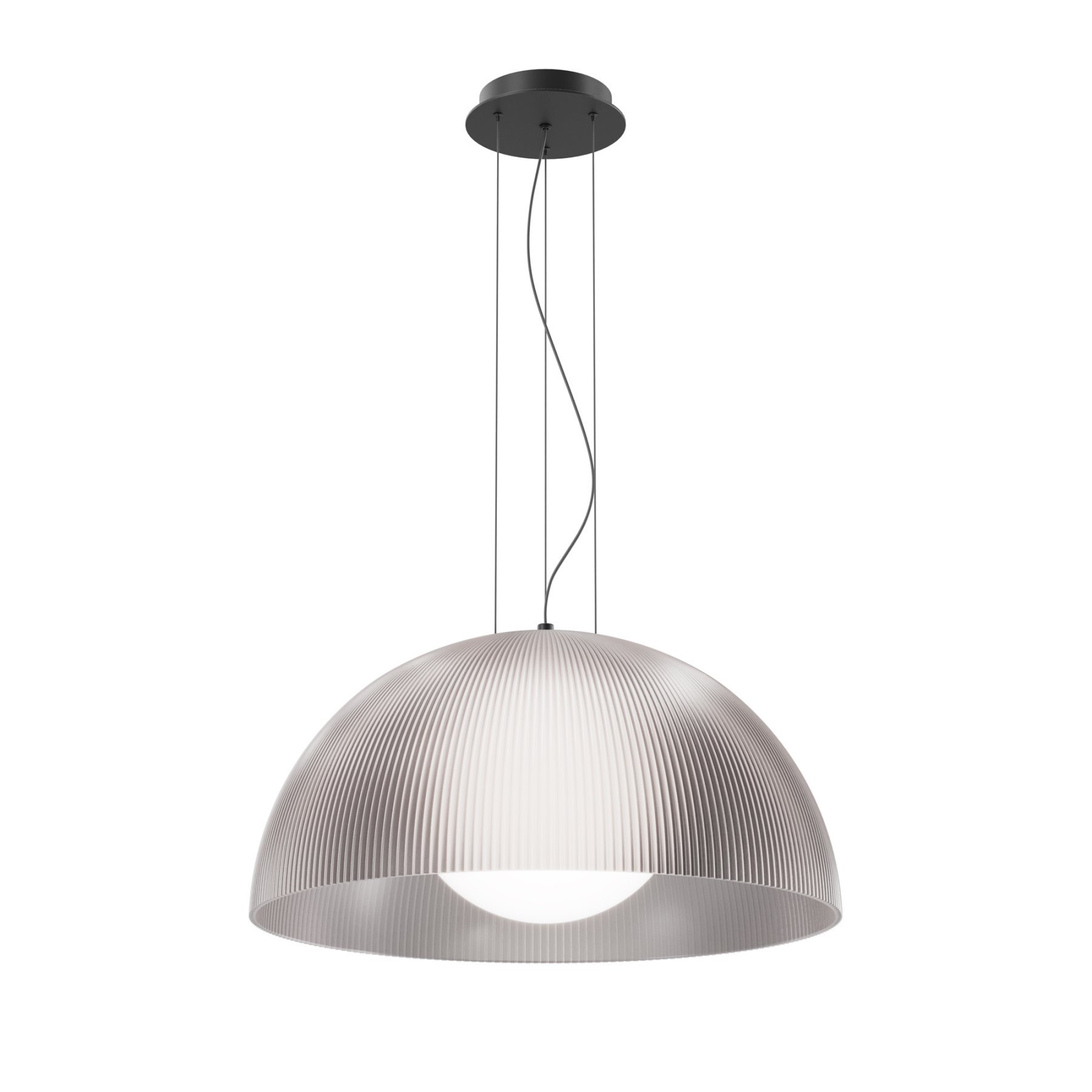 В серии представлены подвесные светильники двух диаметров абажура: 400мм и 600мм. Абажур из рельефного полупрозрачного акрила дымчатого цвета. Встроенный LED-источник с цветовой температурой 3000K. Свет мягко рассеивается матовым акрилом сферической формы. Высокий индекс цветопередачи CRI 90. Арматура из металла с черным покрытием "сэнди". Длина провода регулируется до 3000 мм. Предназначены для основного рассеянного освещения. Универсальное применение в жилых и коммерческих интерьерах.