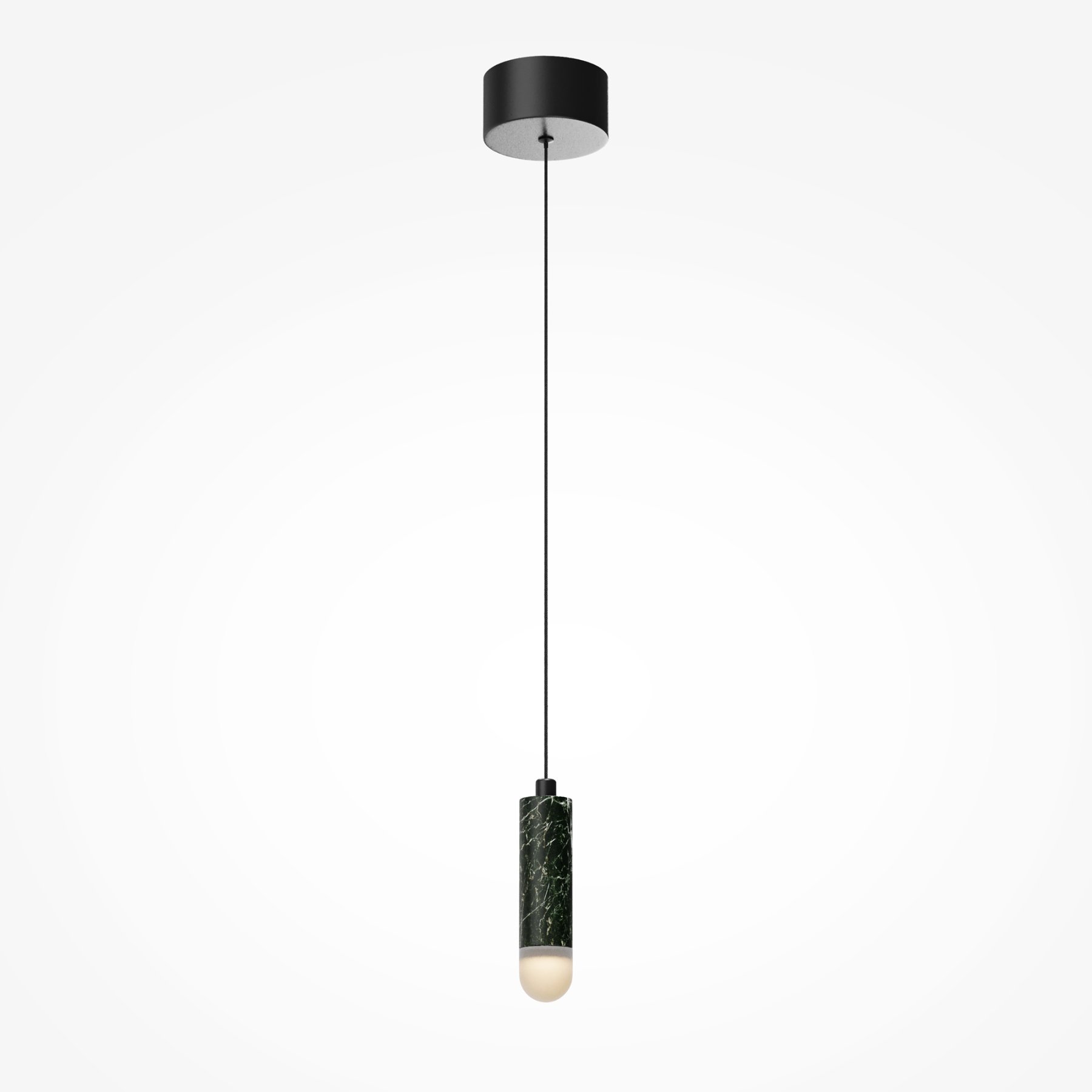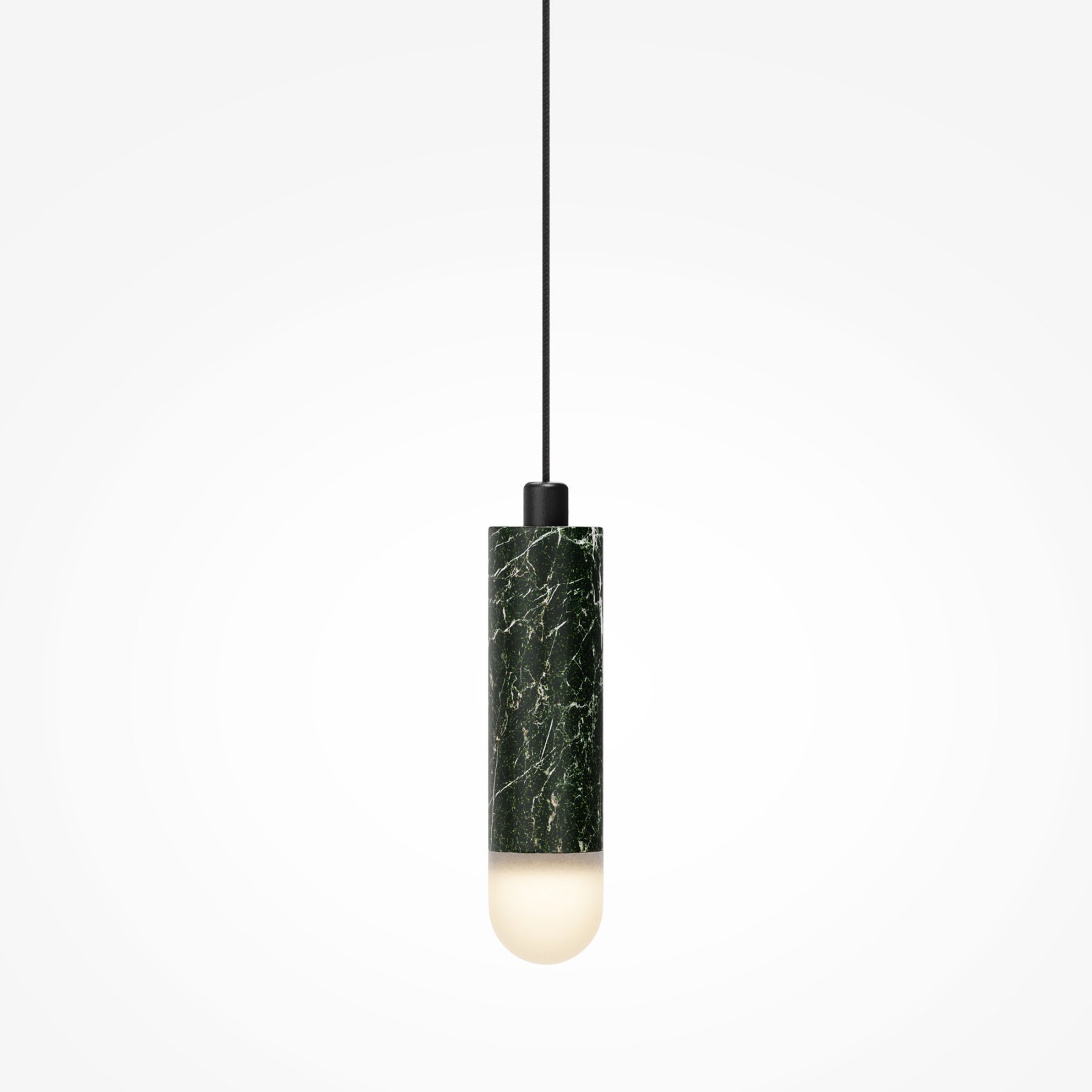 Главный акцент серии — натуральный зелёный мрамор с его неповторимым природным рисунком. Чёрная металлическая арматура создаёт гармоничный контраст. LED-источник с температурой 3000К, скрытый за акриловым рассеивателем, создаёт атмосферную подсветку для деликатного зонирования. В серии представлены подвесы двух форм — конус и вытянутый цилиндр, которые можно использовать как сольные акценты или комбинировать в многоуровневые композиции, меняя длину провода (3000 мм).