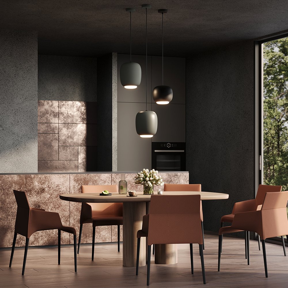 В серии три модели с диаметрами 220 мм, 230 мм и 300 мм. Корпус и плафон выполнены из алюминия с антибликовым покрытием в трех цветах: черный, серый, белый. Рассеиватель — пластик с глянцевой текстурой. Все модели оснащены встроенным LED-источником света с цветовой температурой 3000K, высоким индексом цветопередачи CRI>90 и широким углом рассеивания 180°. Разнообразие форм и размеров позволяют создавать одиночные или групповые акценты в большинстве современных интерьеров.
