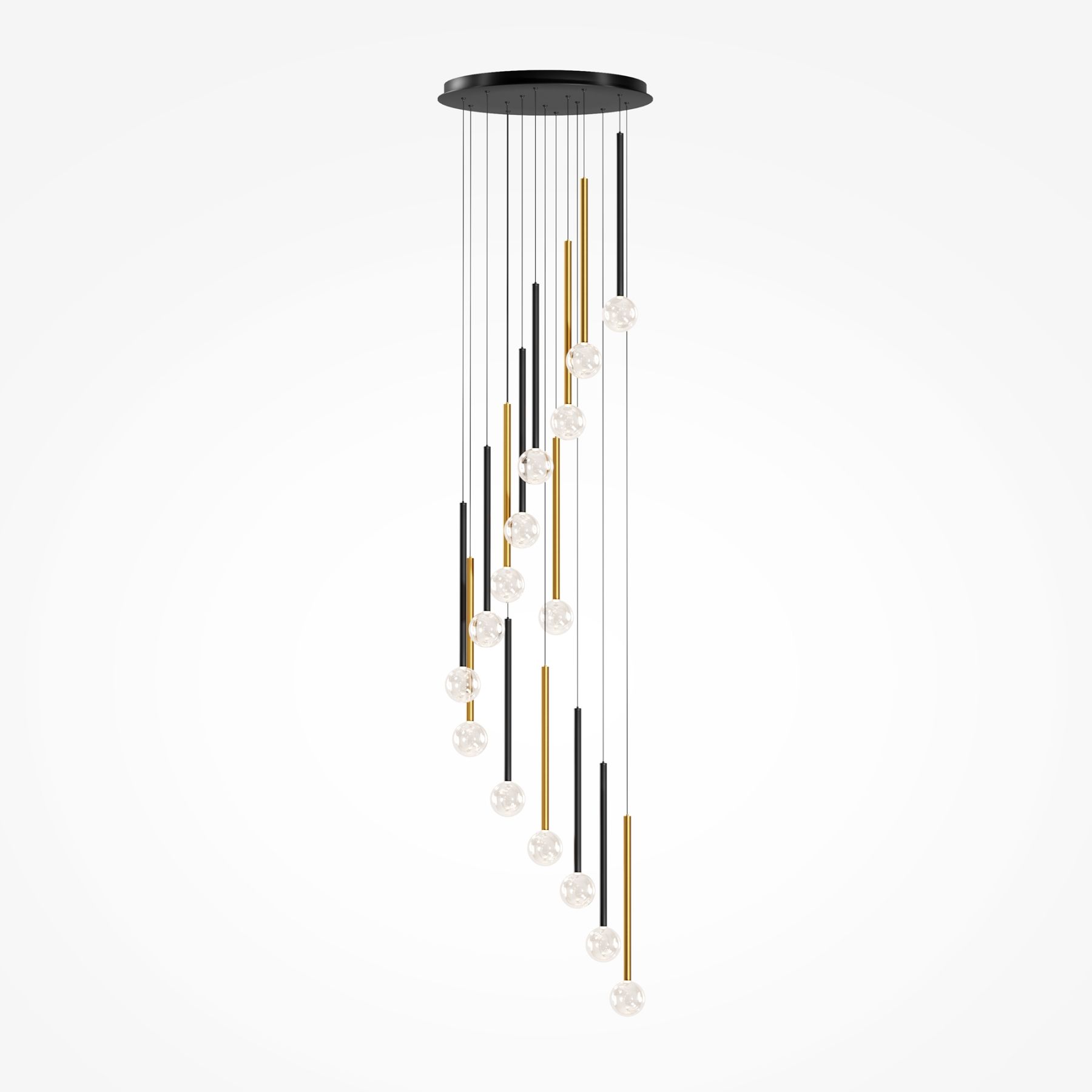 Цвет арматуры — черный, латунь, комбинация черный и латунь. Материал арматуры — металл. Цветовая температура 3000К. Оригинальный «невесомый» дизайн с тонкими металлическими трубками и стеклянными шарами-плафонами. LED-источники света. Регулируемая длина провода подвесных светильников, 3 метра, подходит для помещений с высокими потолками. Каскадная композиция на 7 и 15 плафонов оснащена проводом длиной 3,5 метра для эффектных дизайнерских решений. Подходит для высоких потолков. Парящие модели для создания легкой, воздушной атмосферы в интерьере.