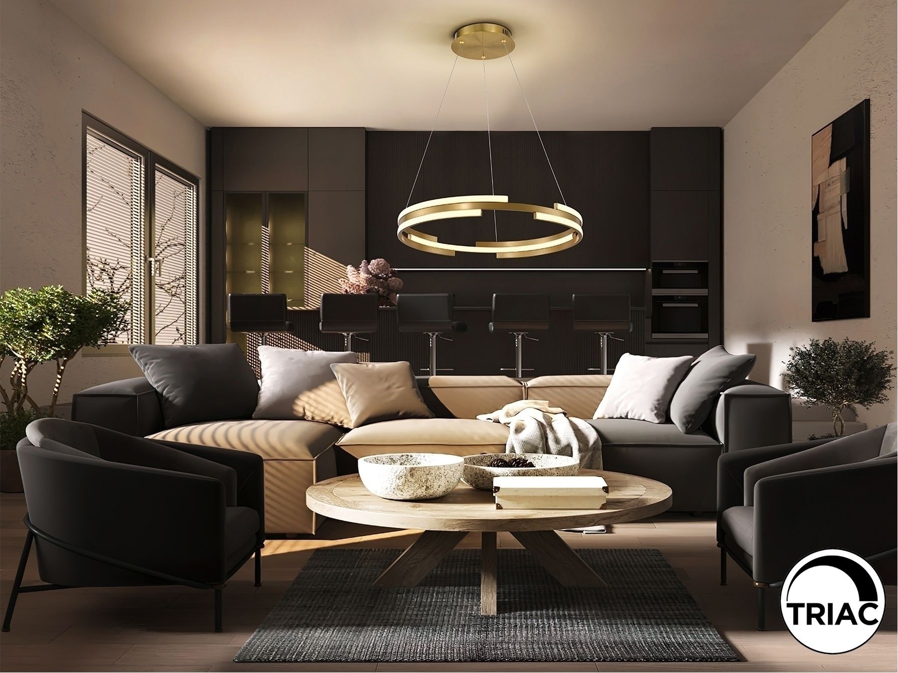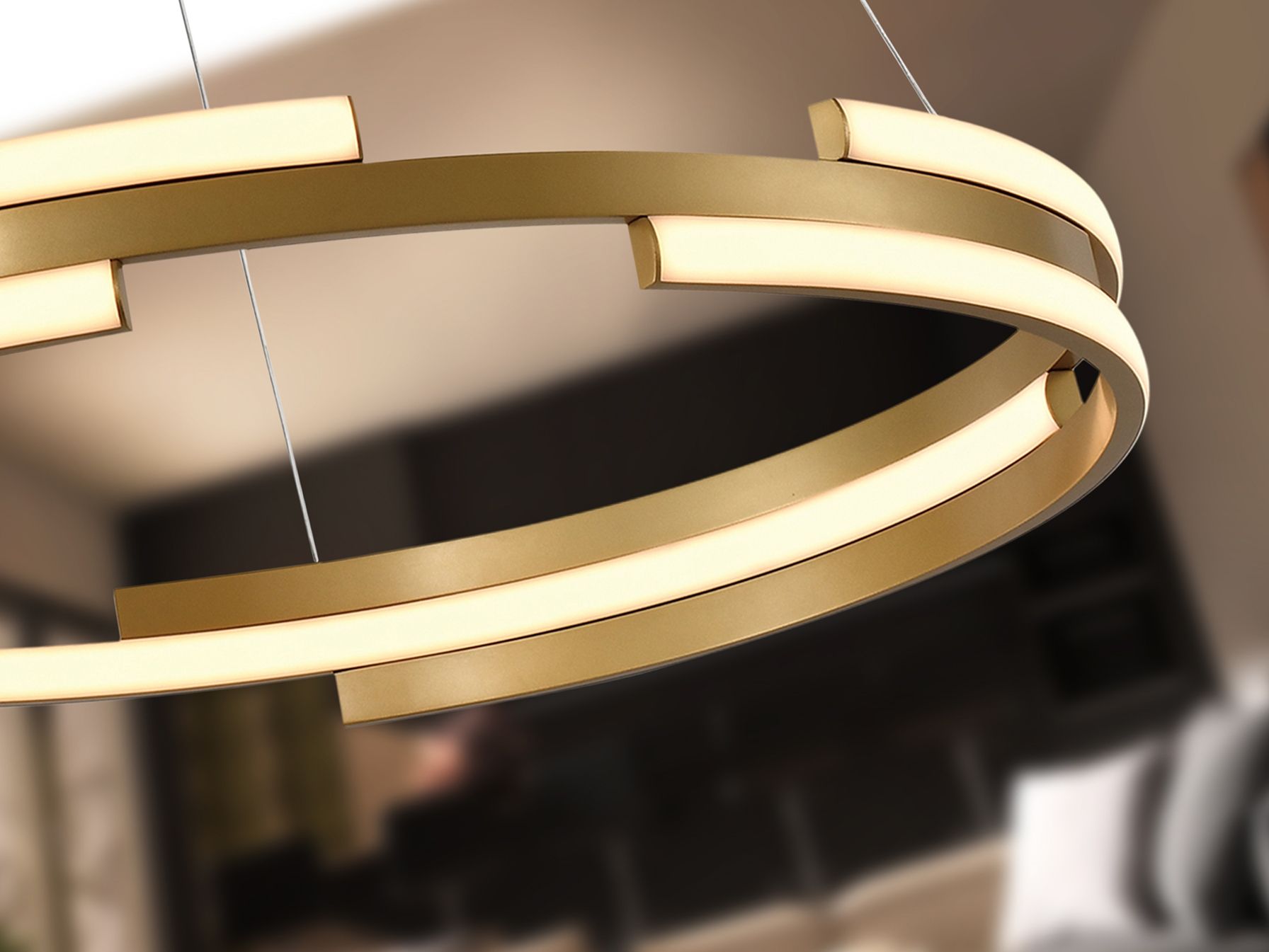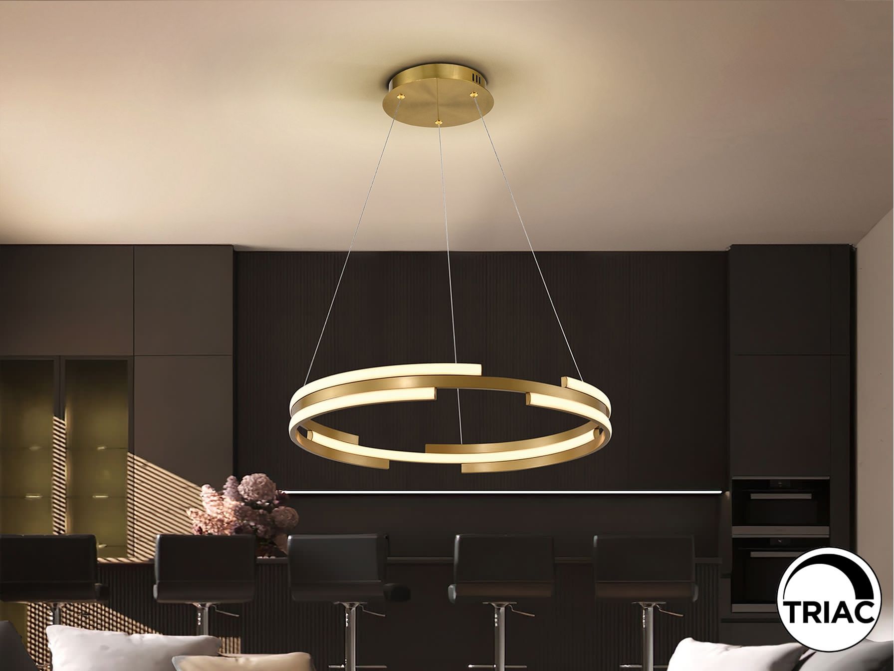 Светильник из металла и алюминия с золотой отделкой. Опаловый силиконовый рассеиватель. Светодиоды мощностью 52 Вт. 3800 лм. 3000К. ДИММИРУЕМАЯ.