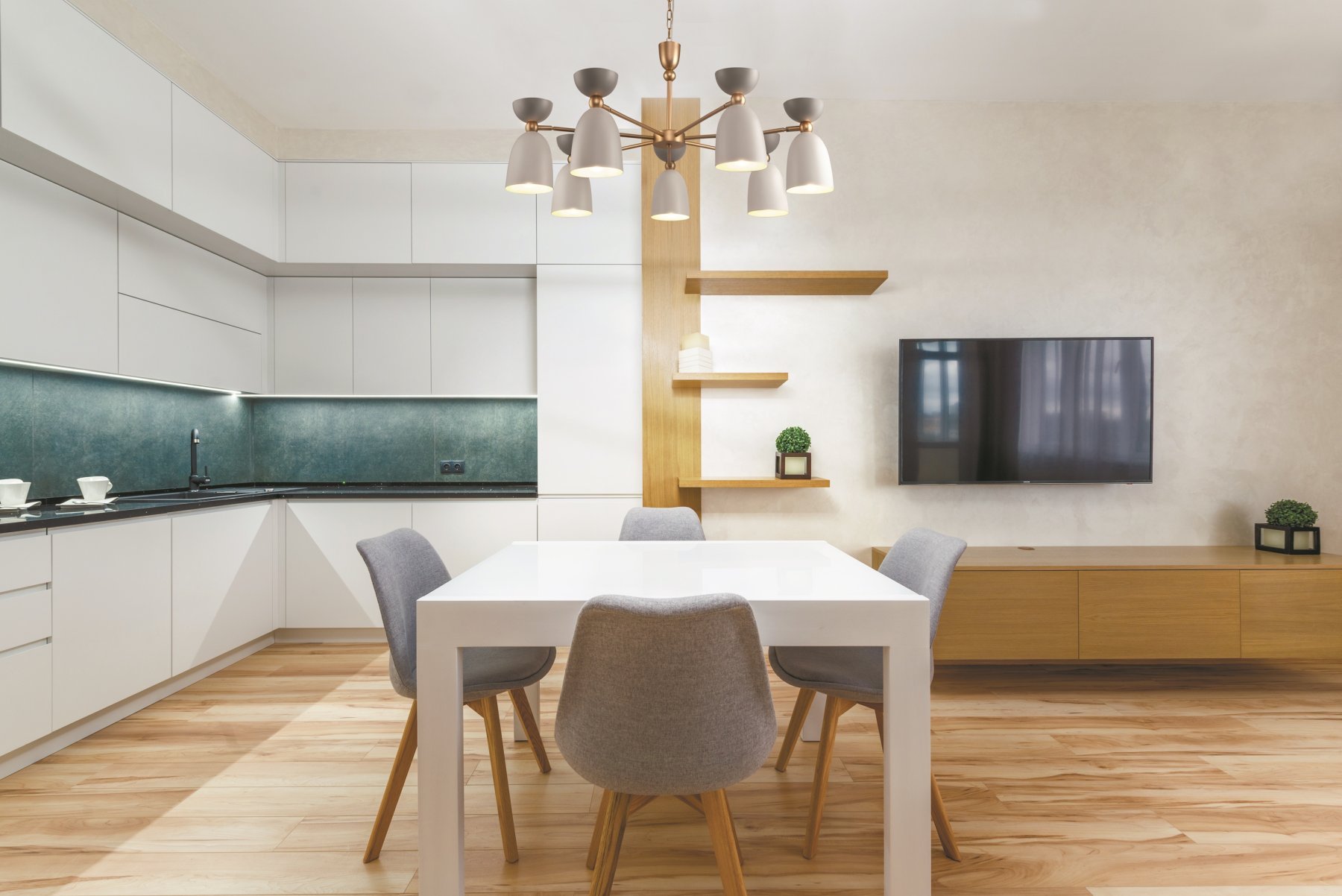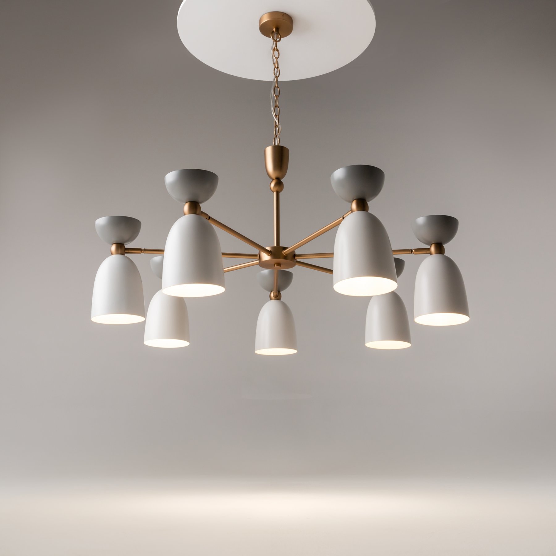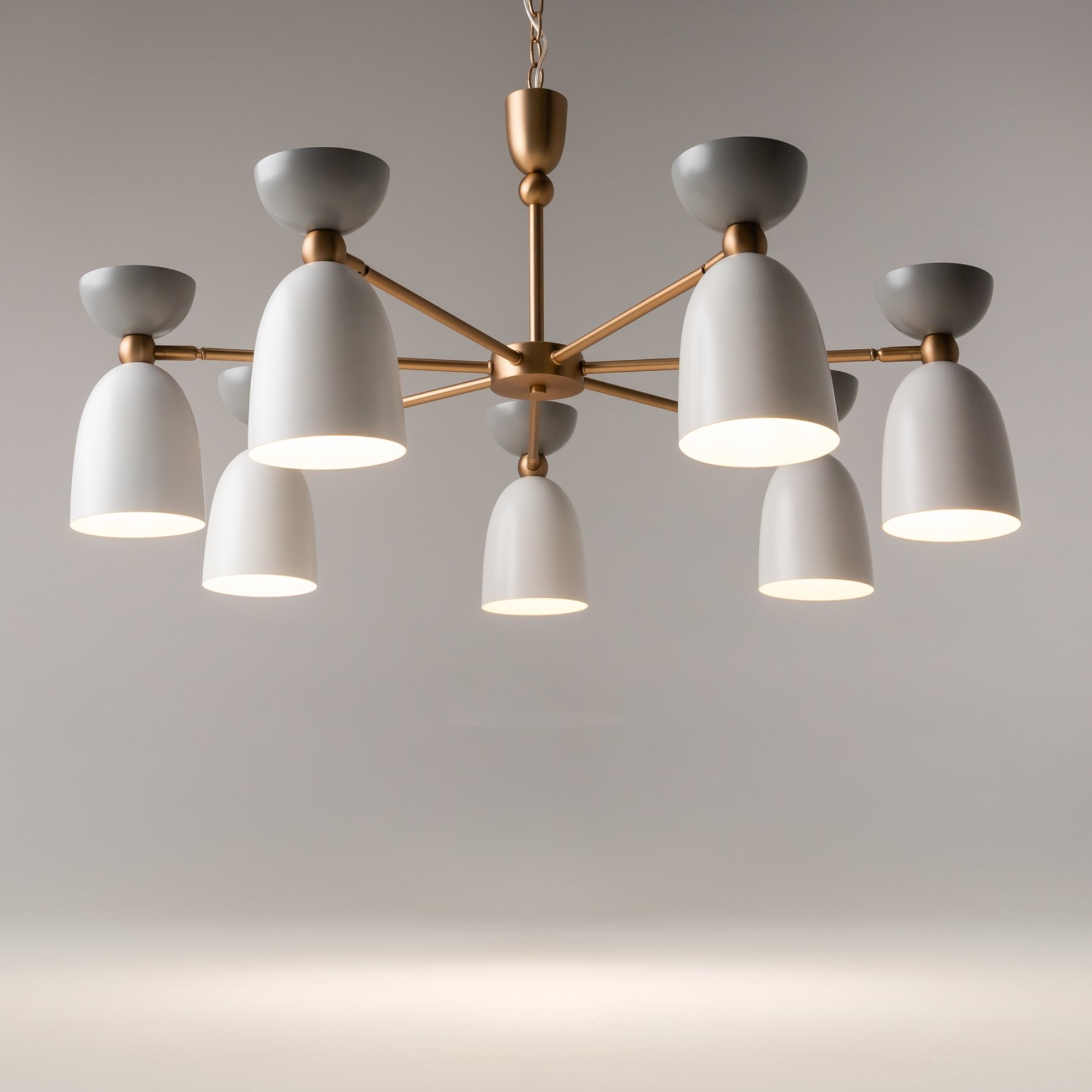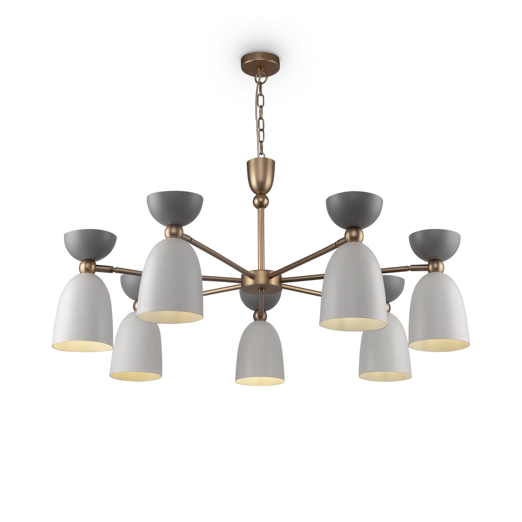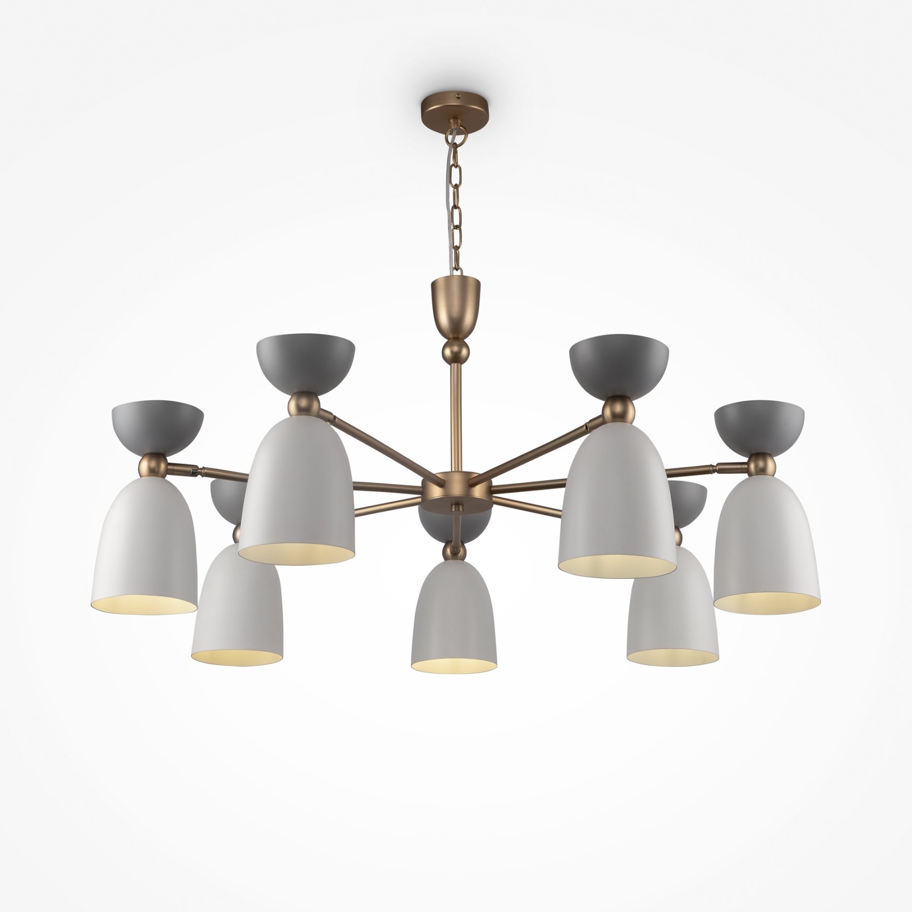 Арматура из металла, оттенки – латунь, белый. Металлические плафоны в двух цветовых решениях: белый + серый, голубой + бирюзовый. Оригинальная форма колокольчика. Поворотный механизм в плафонах для направленной подсветки.