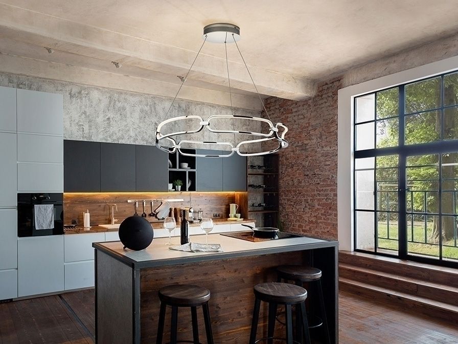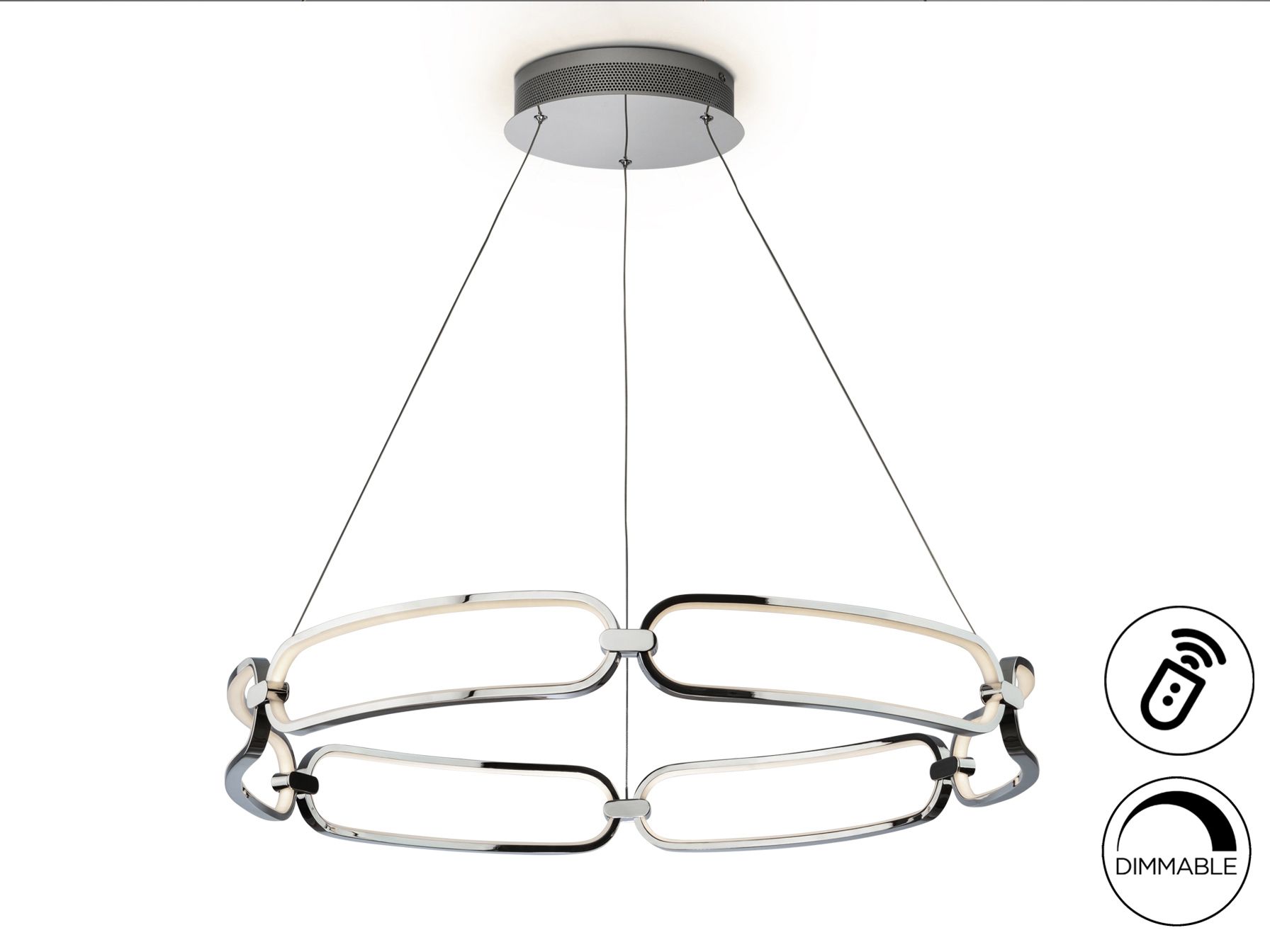 Большой светодиодный светильник из алюминия с хромированным покрытием. Опаловые силиконовые диффузоры. Регулируется по высоте. Светодиод 65 Вт, 5,850 лм, 3,000 К. С возможностью затемнения. Включает пульт дистанционного управления.