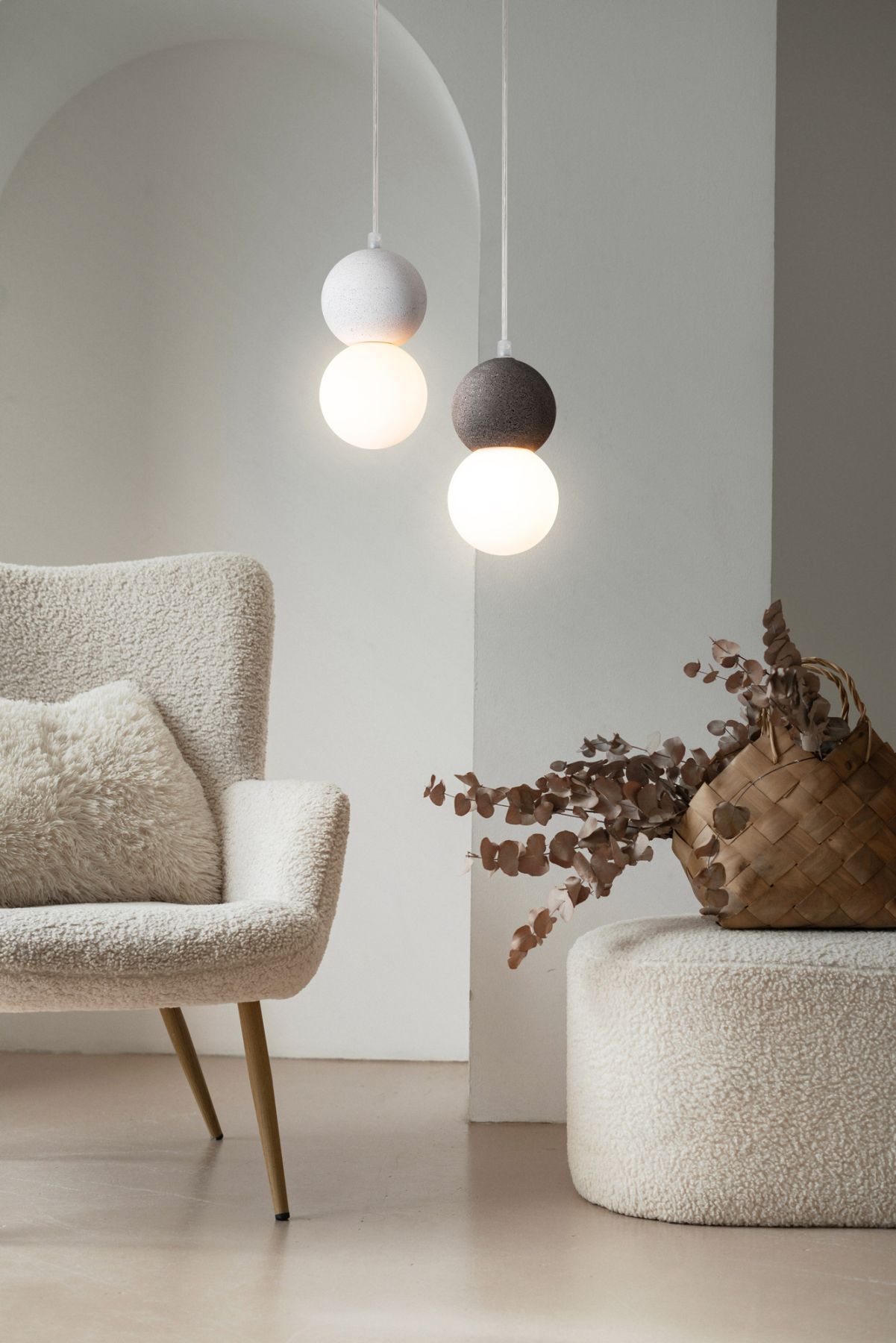 Серия Concrete подходит для минималистичных и даже детских интерьеров. Плафоны белое матовое стекло и бетонный декоративный элемент той же формы в двух цветах: белый и серый. Подвесы можно комбинировать между собой, что позволяет создавать интересные визуальные контрасты. Арматура — металл белого цвета. Подвесные светильники оснащены цоколем G9, рассчитаны на 1 лампу мощностью до 40 Вт. Провод прозрачный, что подчеркивает легкость дизайна.
