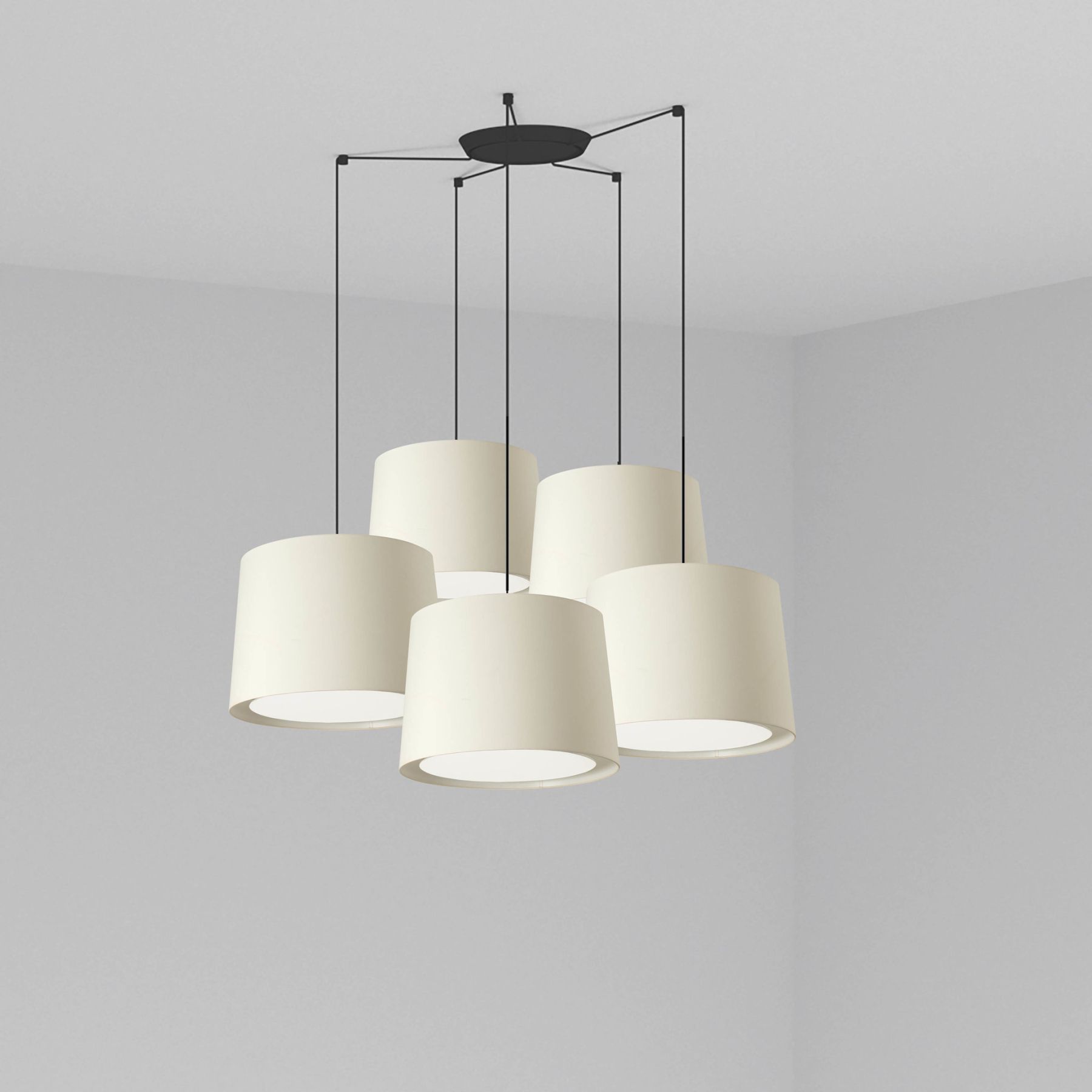 Версия с 5 лампами. CONGA — это коллекция ламп для внутреннего освещения, разработанная Faro Lab. Этот черный подвесной светильник с белым текстильным абажуром предназначен для освещения спален и гостиных. Это хороший выбор для отелей.