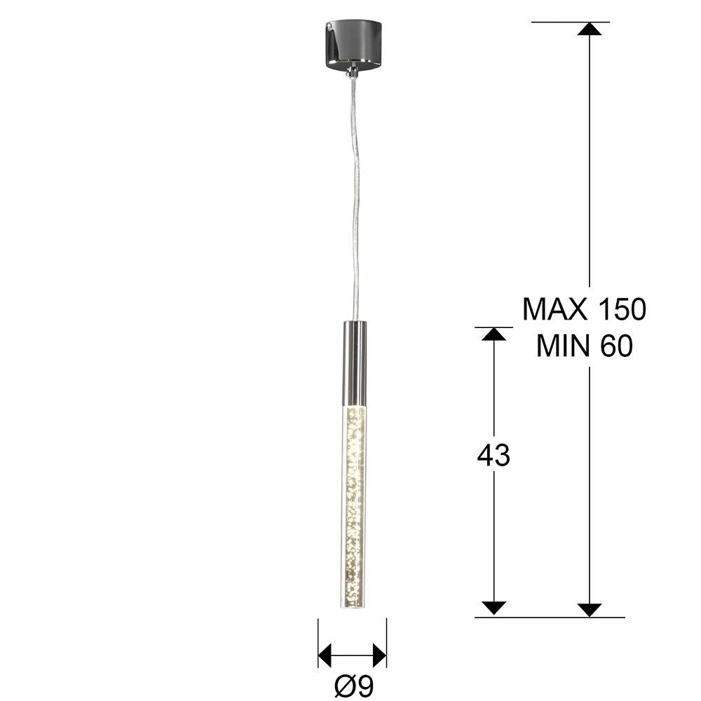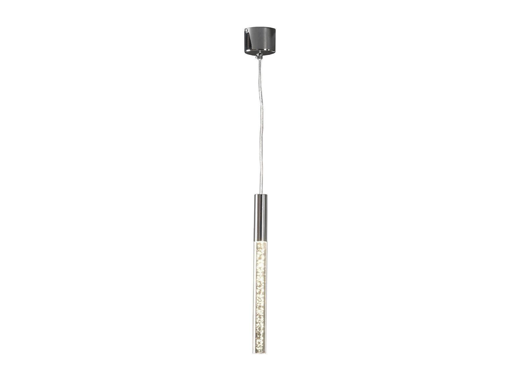Подвесной светодиодный светильник из металла с покрытием "блестящий хром", с трубкой из прозрачной акриловой пластмассы с декоративными пузырьками внутри.