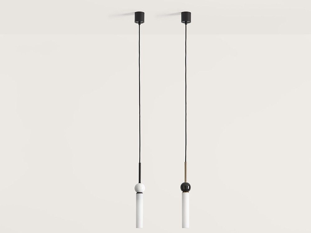 Подвесной светильник из металла матового черного или золотого цвета с цилиндрическим абажуром из непрозрачного стекла и декоративным мраморным шаром.