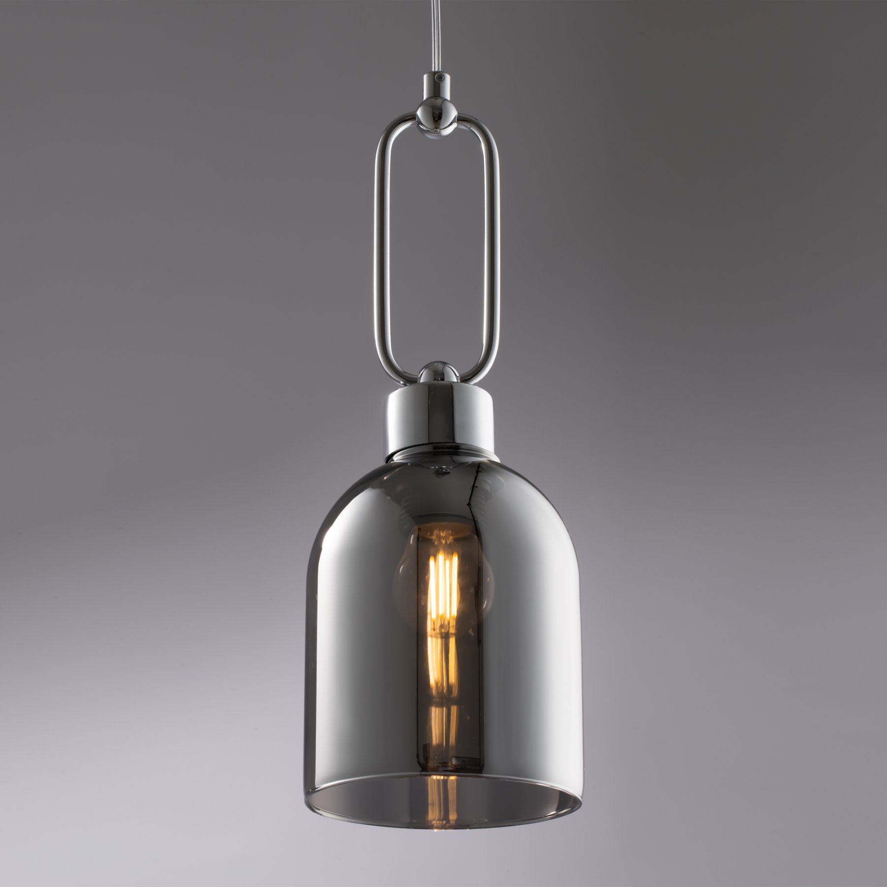 Хромированная металлическая арматура. Стеклянный плафон гальванизирован в тон арматуре. Трендовый арочный силуэт. В качестве источника света используется лампа с цоколем Е27.