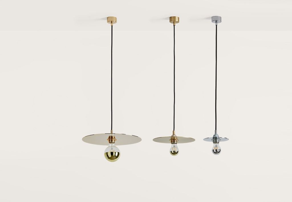 Потолочный светильник простого дизайна с металлическим диском в хромированном, золотом или черном исполнении, доступен в различных размерах.