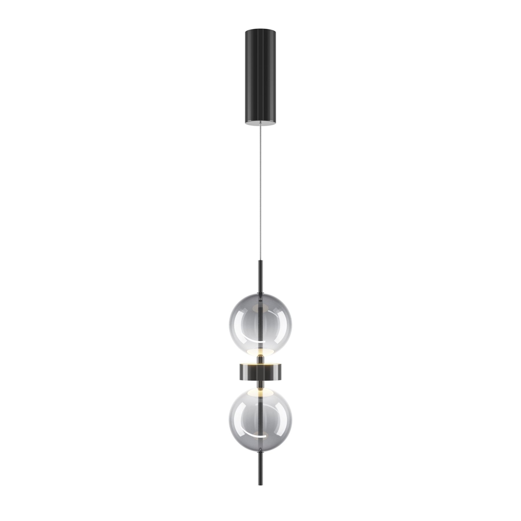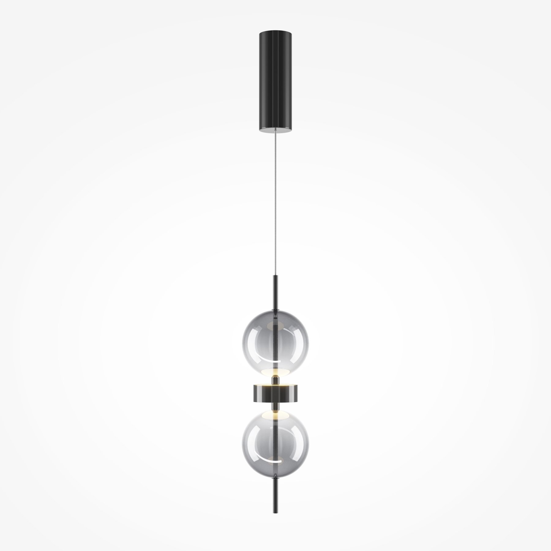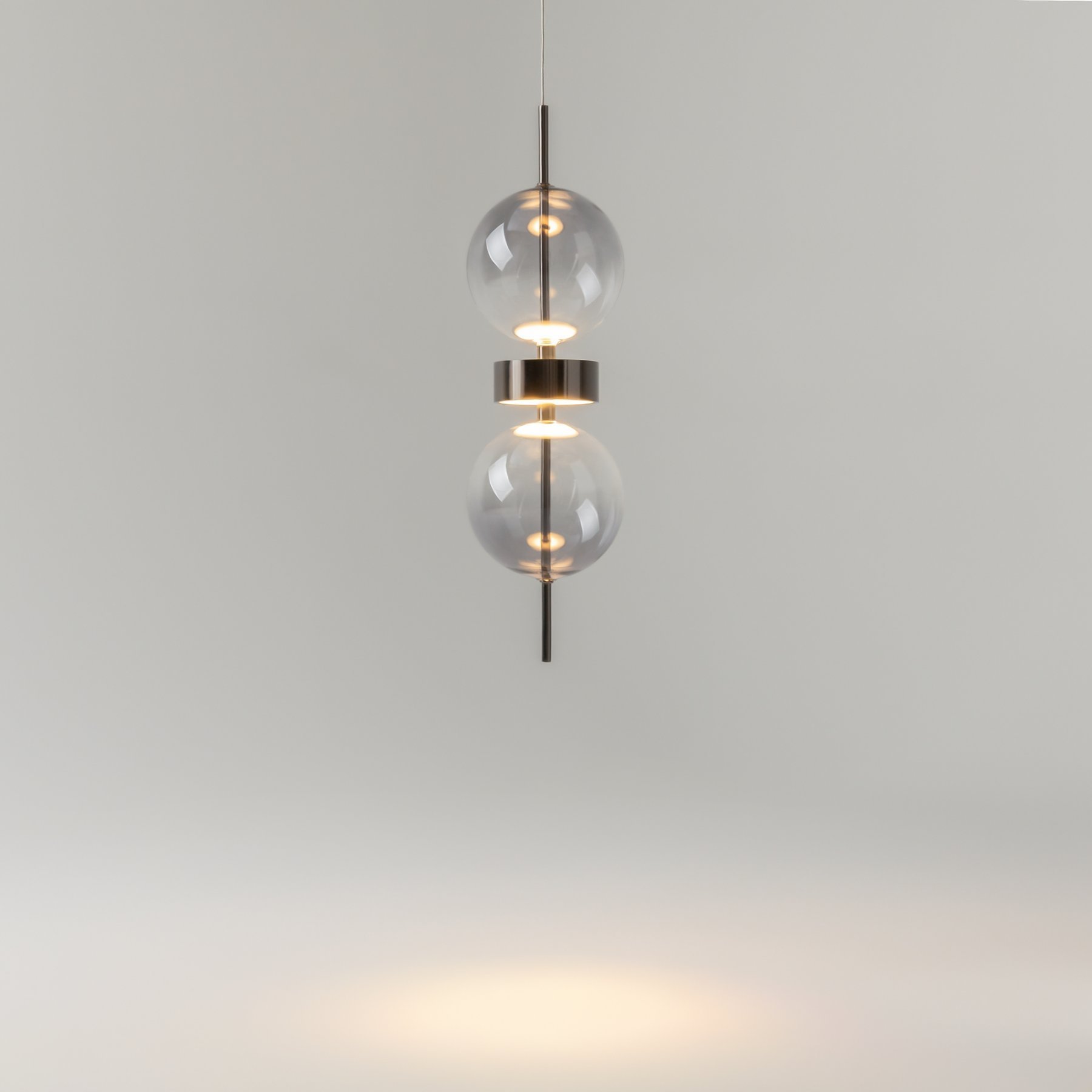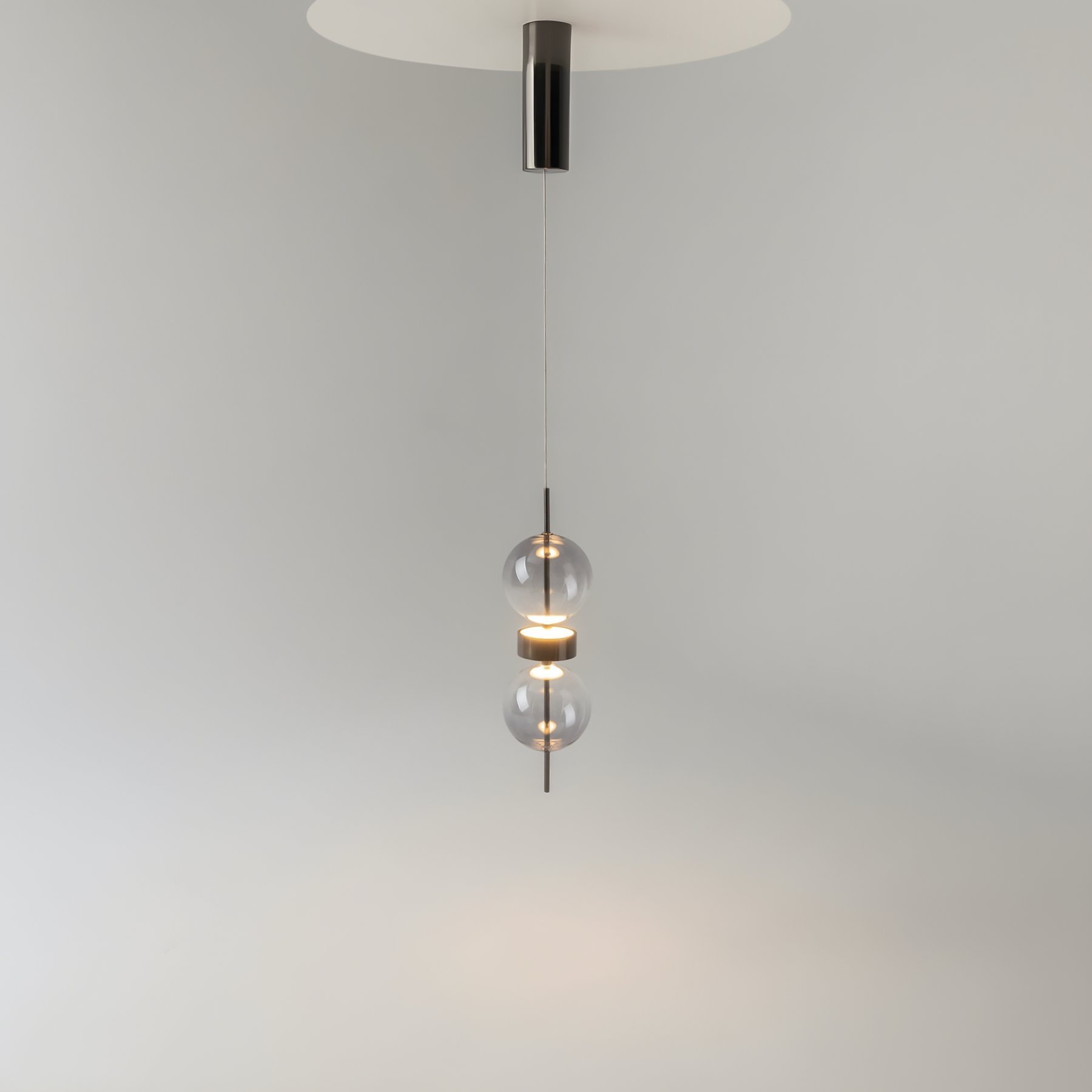 Серия включает подвесной светильник, бра, напольный и портативную модели. Стеклянные плафоны с зеркальным градиентом, черная глянцевая арматура из металла. LED-источник (3000K) скрыт матовым рассеивателем. Конструктивные особенности: магнитные потолочные чаши у подвесов и магнитное основание у бра обеспечивают монтаж без видимого крепежа. Напольный и аккумуляторный светильники диммируются при длительном удержании кнопки. Серия отмечена премиями Red Dot и A’design за инновационный дизайн.
