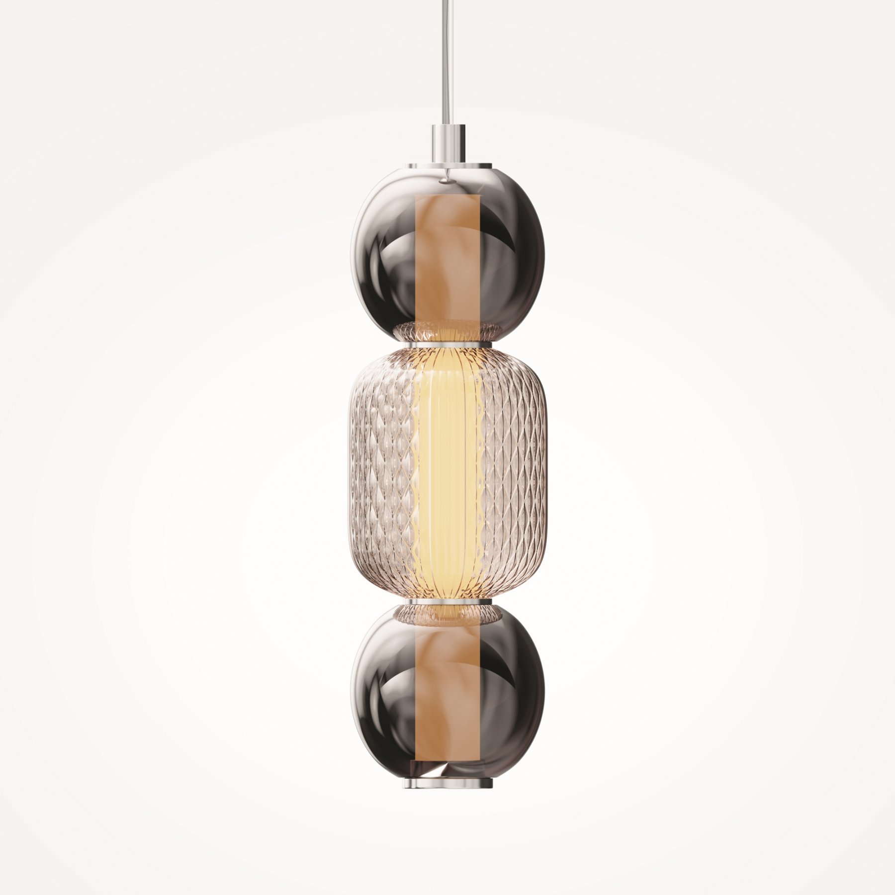 Материал арматуры - металл, цвета - золото, хром. Микс плафонов: гладкие cферы коньячного или дымчатого оттенка + округлые рельефные с ромбовидным узором из прозрачного стекла. Регулируемая высота подвесных моделей - максимальная длина провода 3 метра. LED-источник света, цветовая температура 3000К