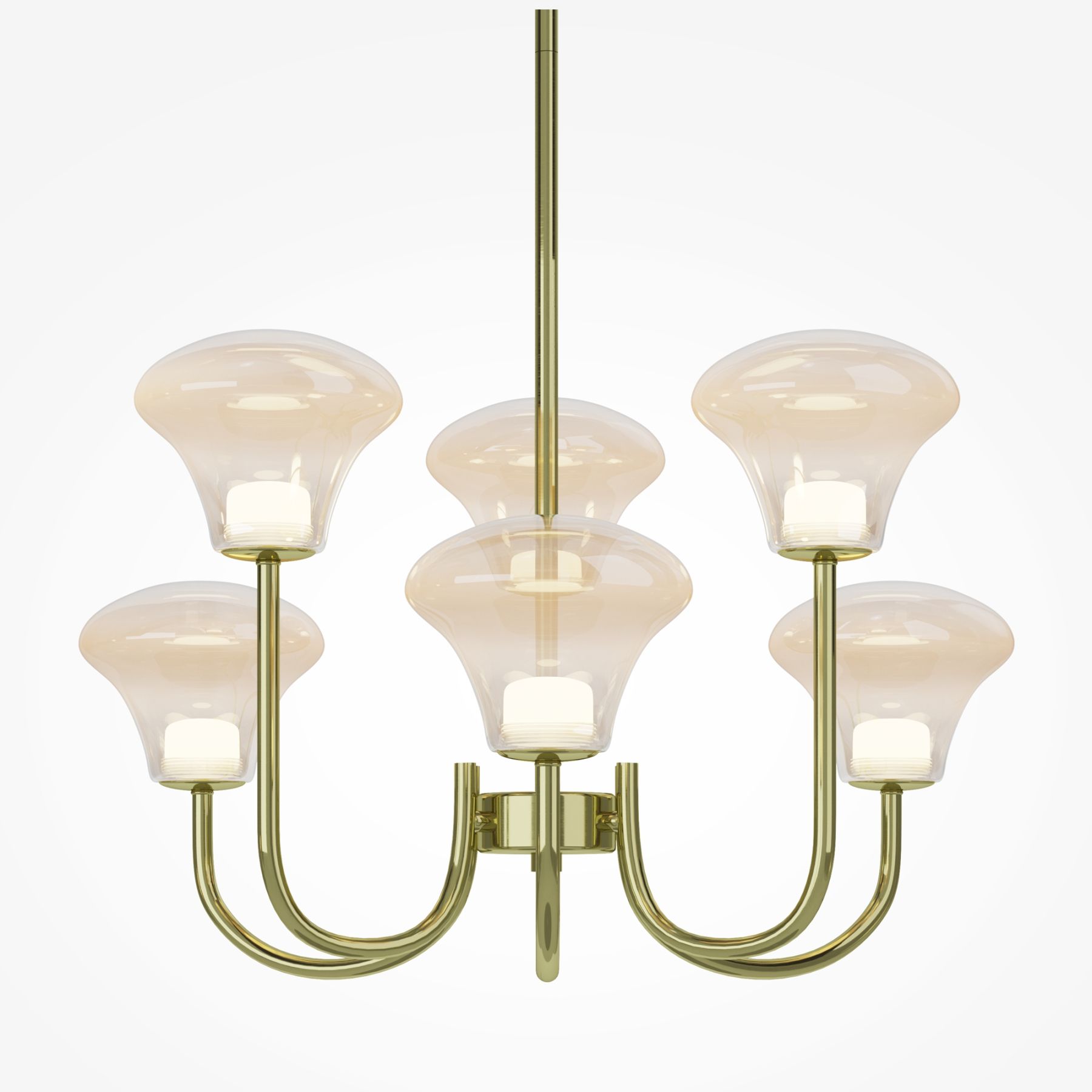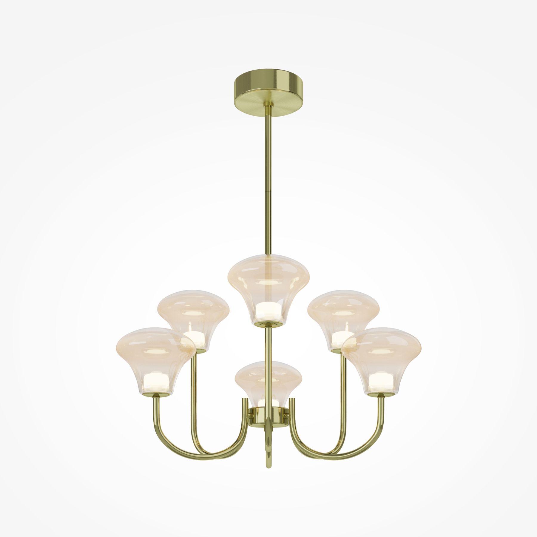 Серия Dynasty вдохновлена атмосферой бальных залов и представлена подвесными светильниками (люстры) на 6 и 8 плафонов, настенным светильником (бра). Обтекаемая форма плафона с градиентом от янтарного к прозрачному. Арочный дизайн металлической арматуры в цвете сатинированной латуни. Блеск металла и глянец стекла дополнены светом LED-источника (3000K). Высота люстр регулируется разборной штангой. Светильники Dynasty станут ярким акцентом в гостиной, столовой, спальне, рабочем кабинете или прихожей.