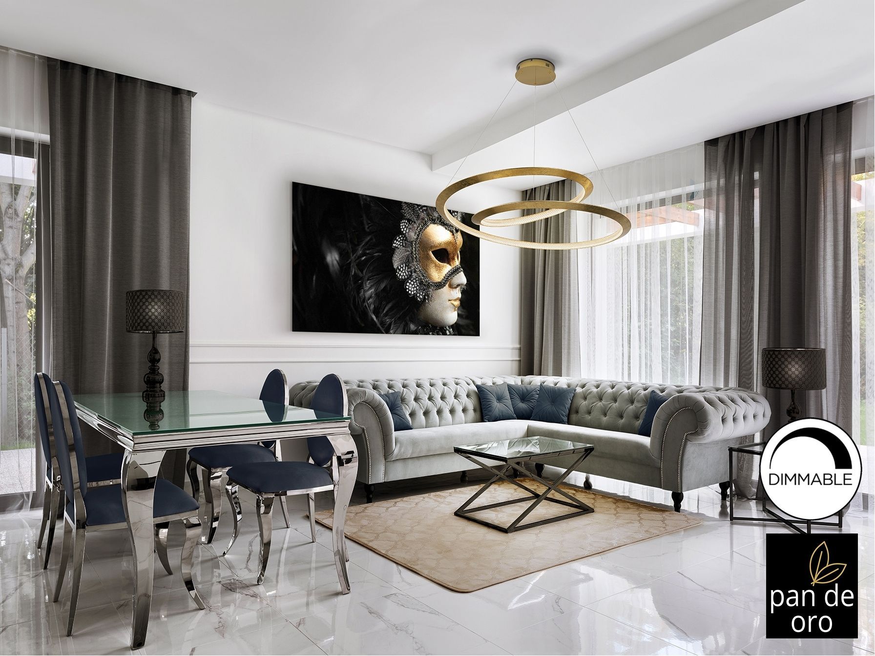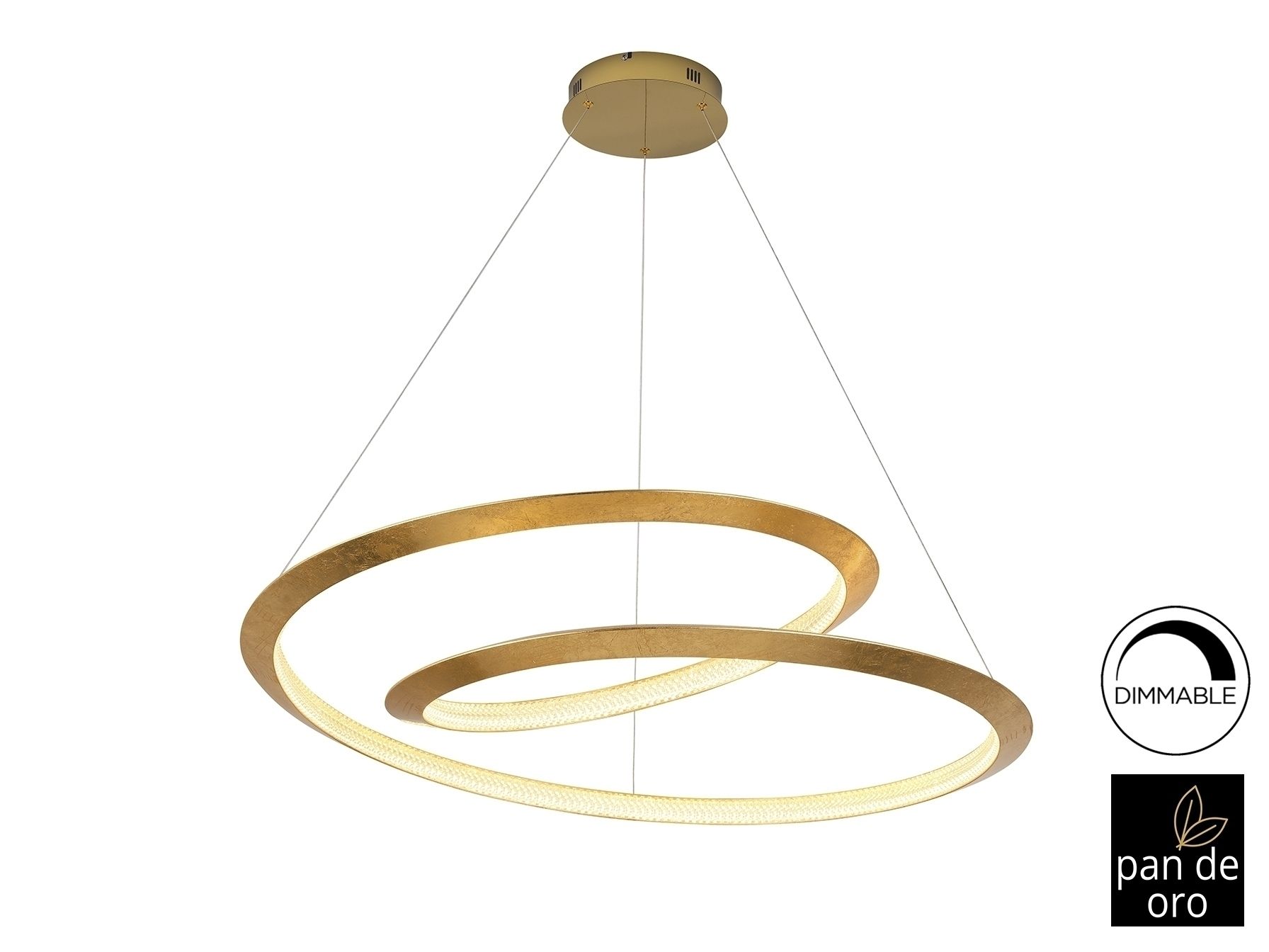 Лампа изготовлена из металла, с изогнутым краем, отделанным золотыми листьями, и золотым куполом. Рассеиватель из прозрачных акриловых деталей. Светодиод мощностью 64 Вт. 3588 лм. 3000 К.