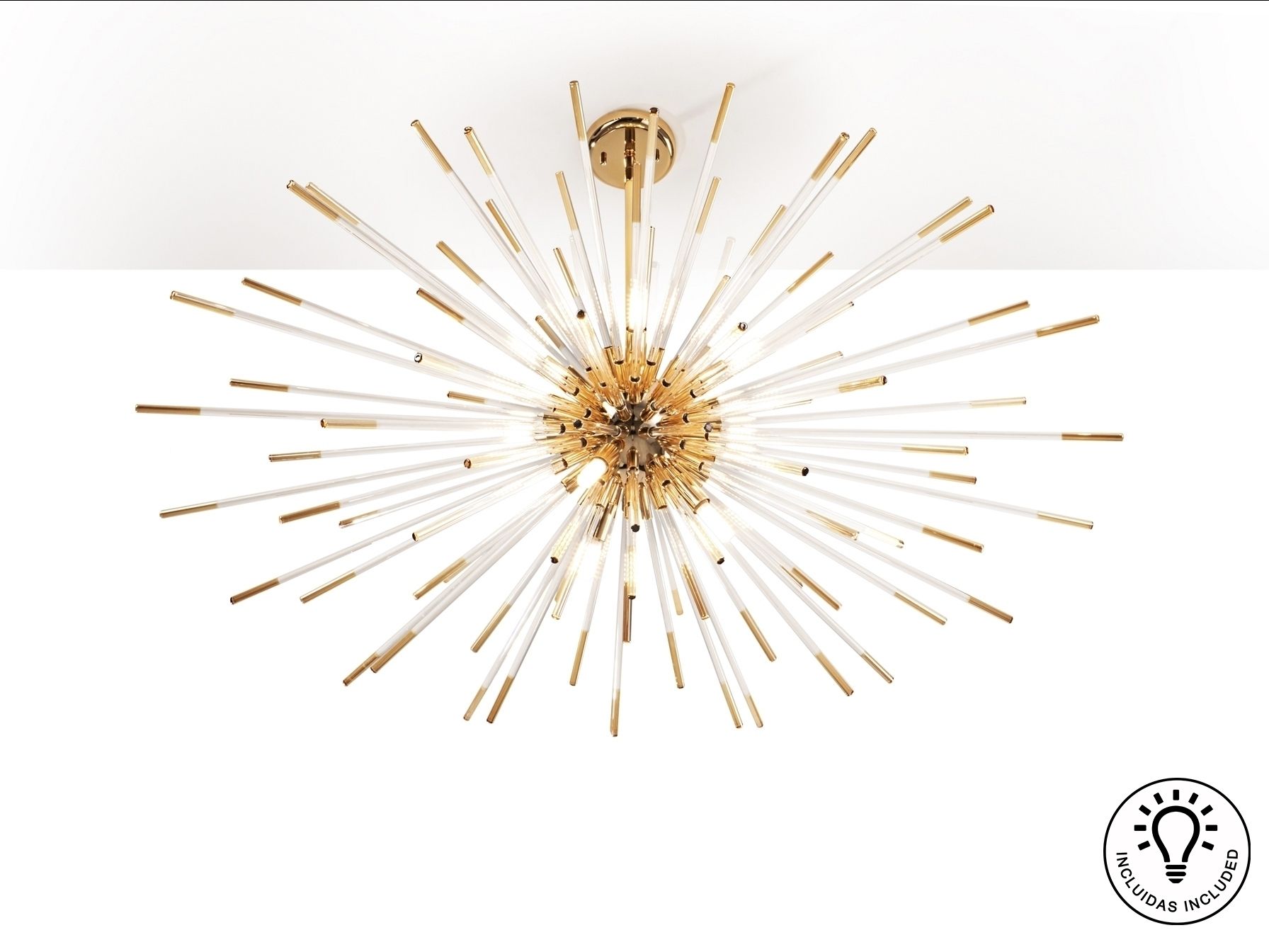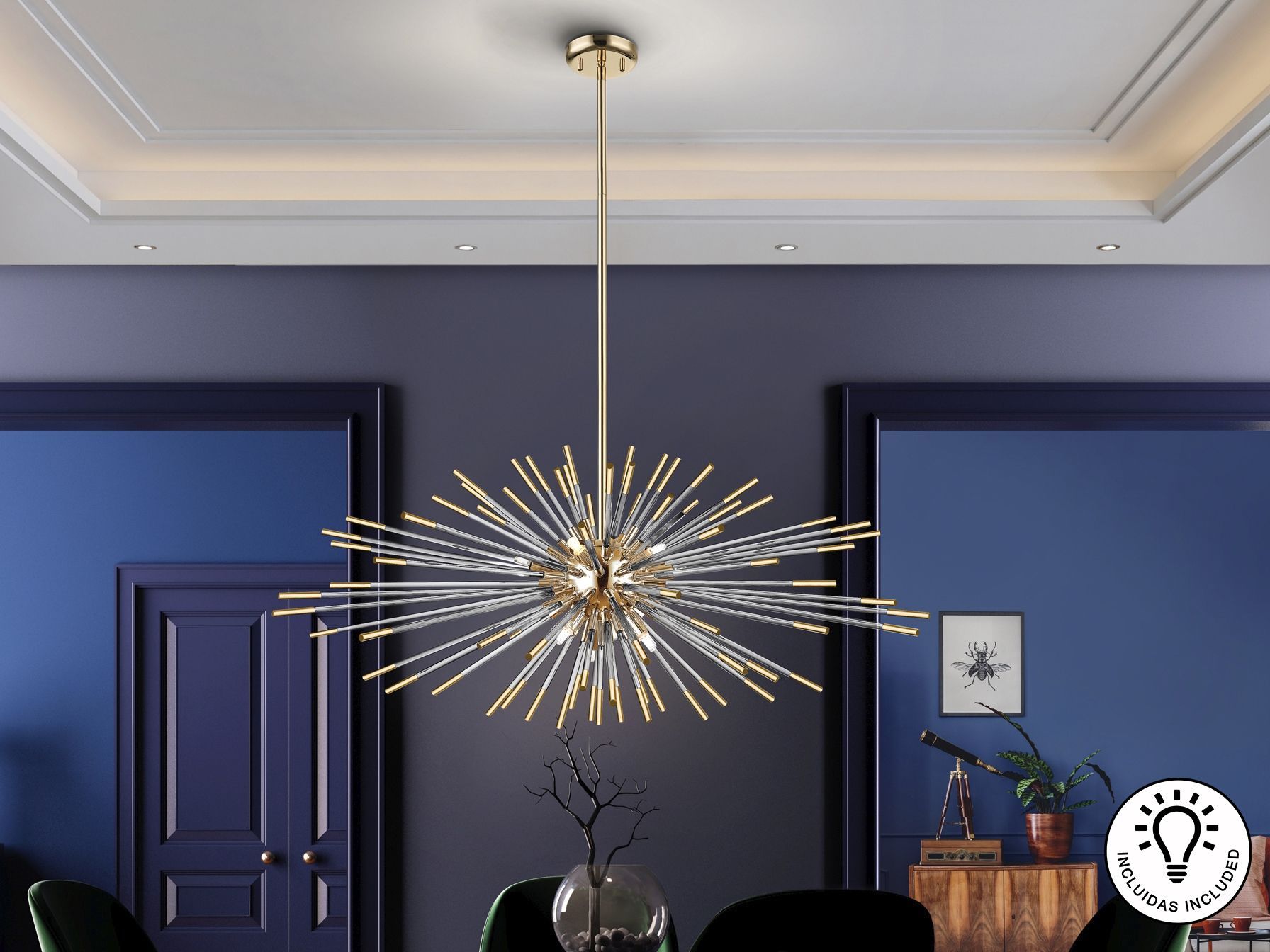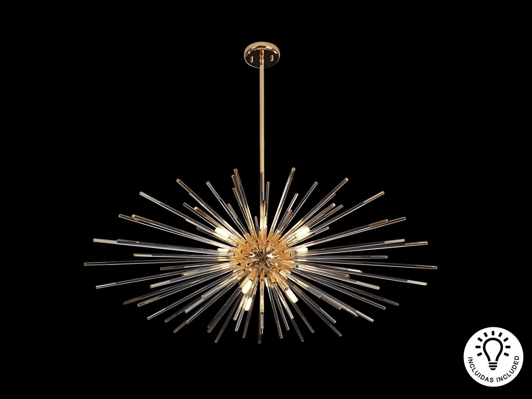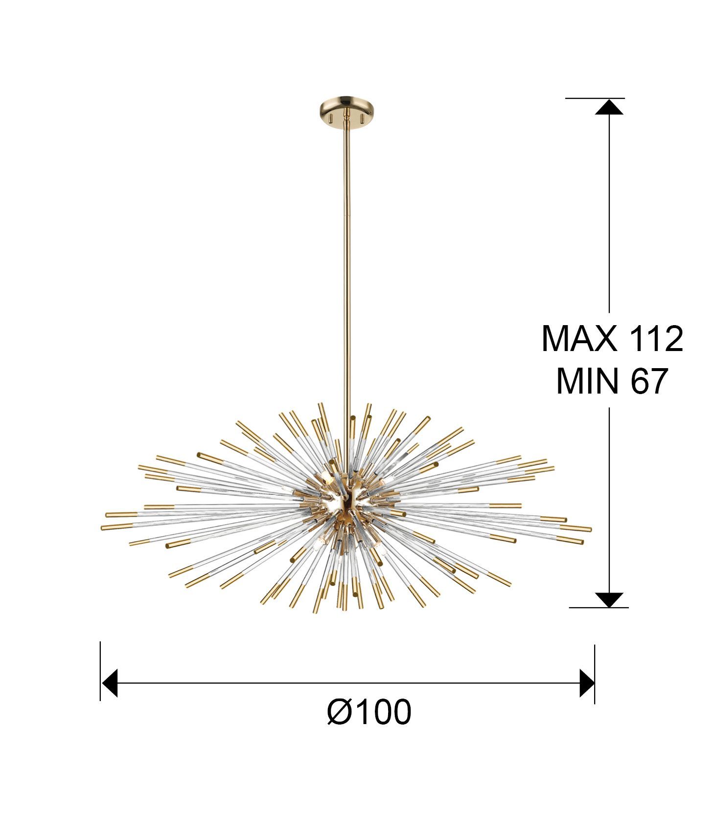 Подвесной шарообразный светильник из золотого металла. Стержни из прозрачного стекла с покрытием "янтарь" на концах, с регулируемой высотой.