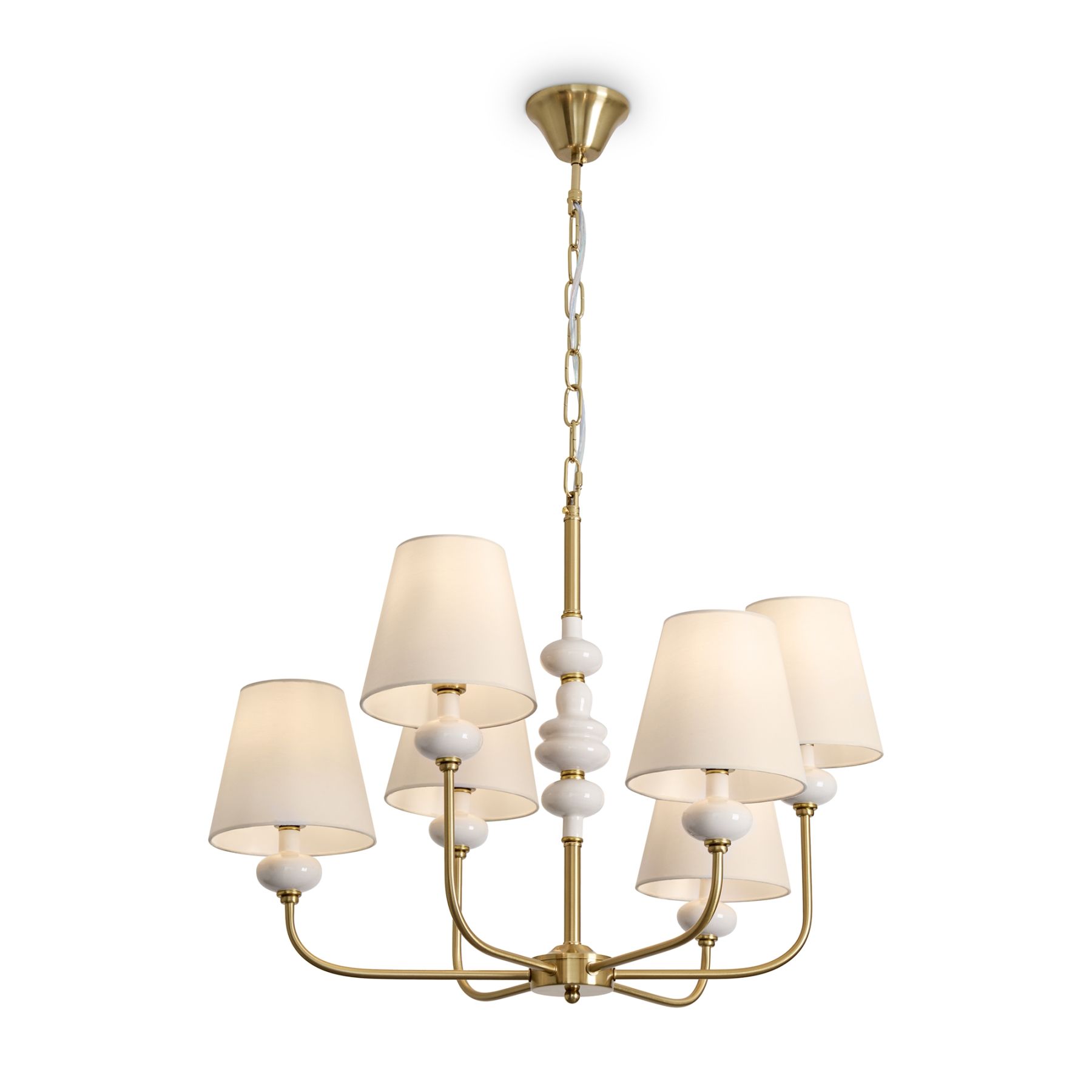 Материал арматуры — металл, цвет — латунь. Подвесные светильники с цоколем E14. Светильники с керамическими декоративными элементами серо бежевых оттенков. Белый абажур, выполнен из натуральной ткани. Сочетание классической элегантности с современным дизайном создает утонченную атмосферу в интерьере.