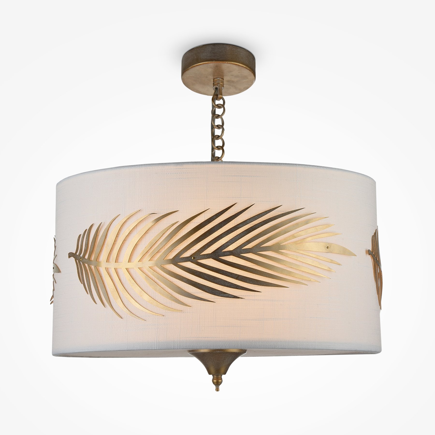 Арматура из металла, цвет – золото. Абажур – белый текстиль на ПВХ. Декор – пальмовая ветвь из листового металла. Рассеиватель фиксируется декоративным наконечником. Высота люстр регулируется.