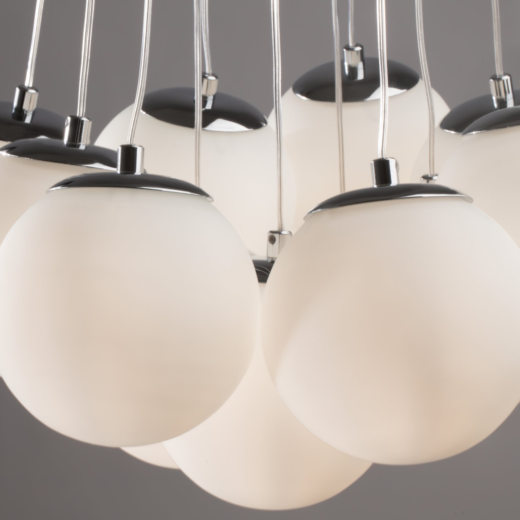 Материал арматуры — металл, цвет — хром/латунь. Подвесные светильники c цоколями E14/E27/G9. Белые стеклянные плафоны с рисунком в виде космических планет крепятся на тонких тросах, которые регулируются по высоте, создавая эффект парящих облаков.
