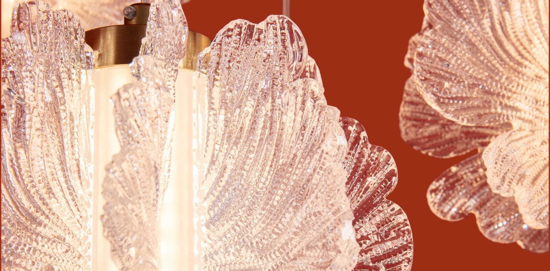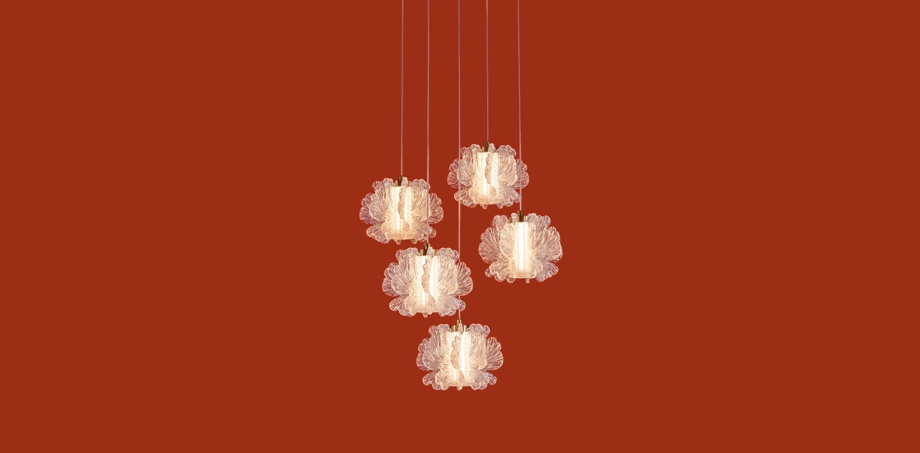 Подвесные светильники Flower: воздушные акриловые плафоны на металле. Встроенные LED (2700K), угол рассеивания 120°. Высота 1200 мм. Два варианта подвесов: каскадный и одинарный.