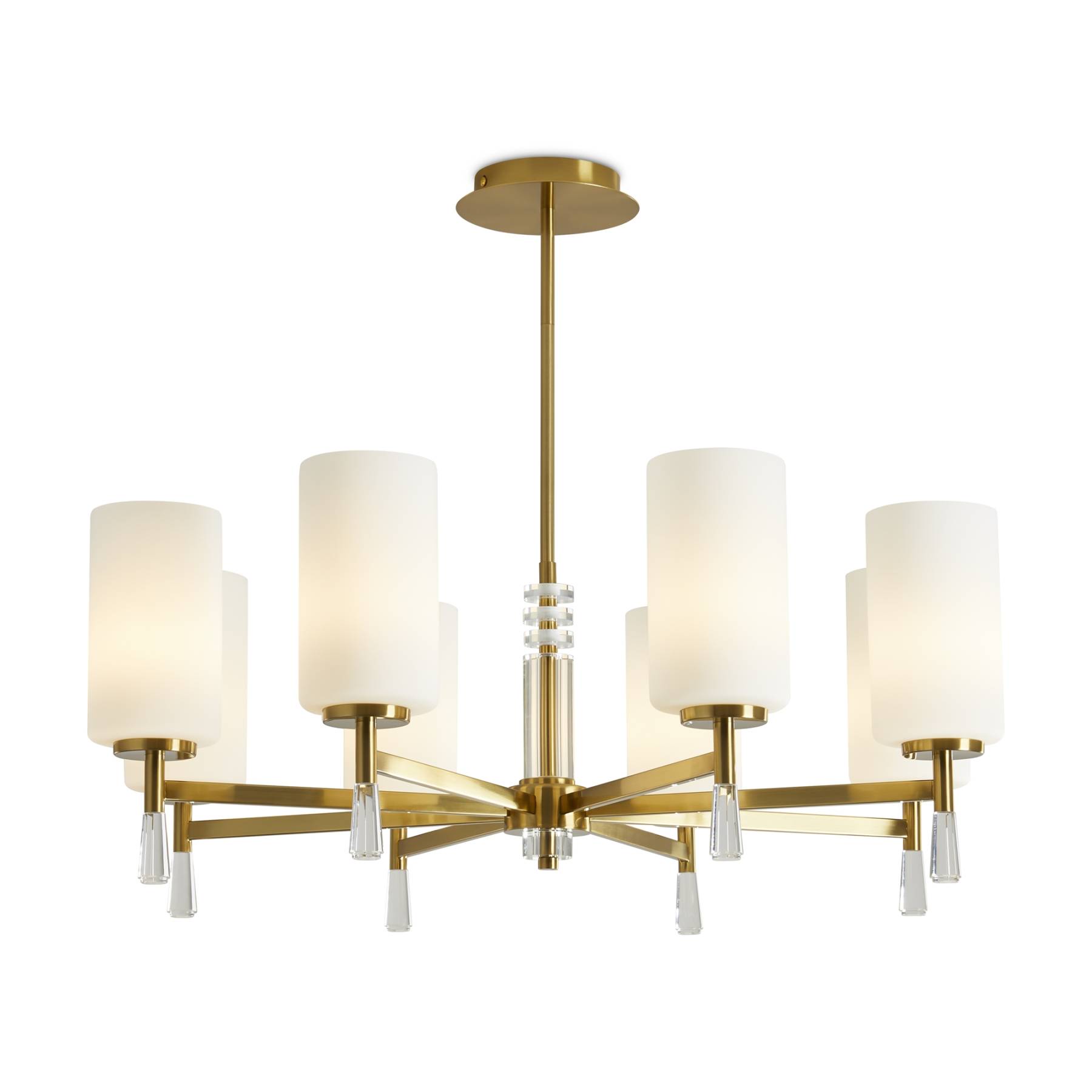 Арматура металл. Цвет латунь. Стеклянные белые плафоны хорошо рассеивают свет, направлены вверх, тем самым вытягивают потолок. Декоративные элементы в виде хрустального основания и капель из акрила. Источник света — лампа. Цоколь E27.