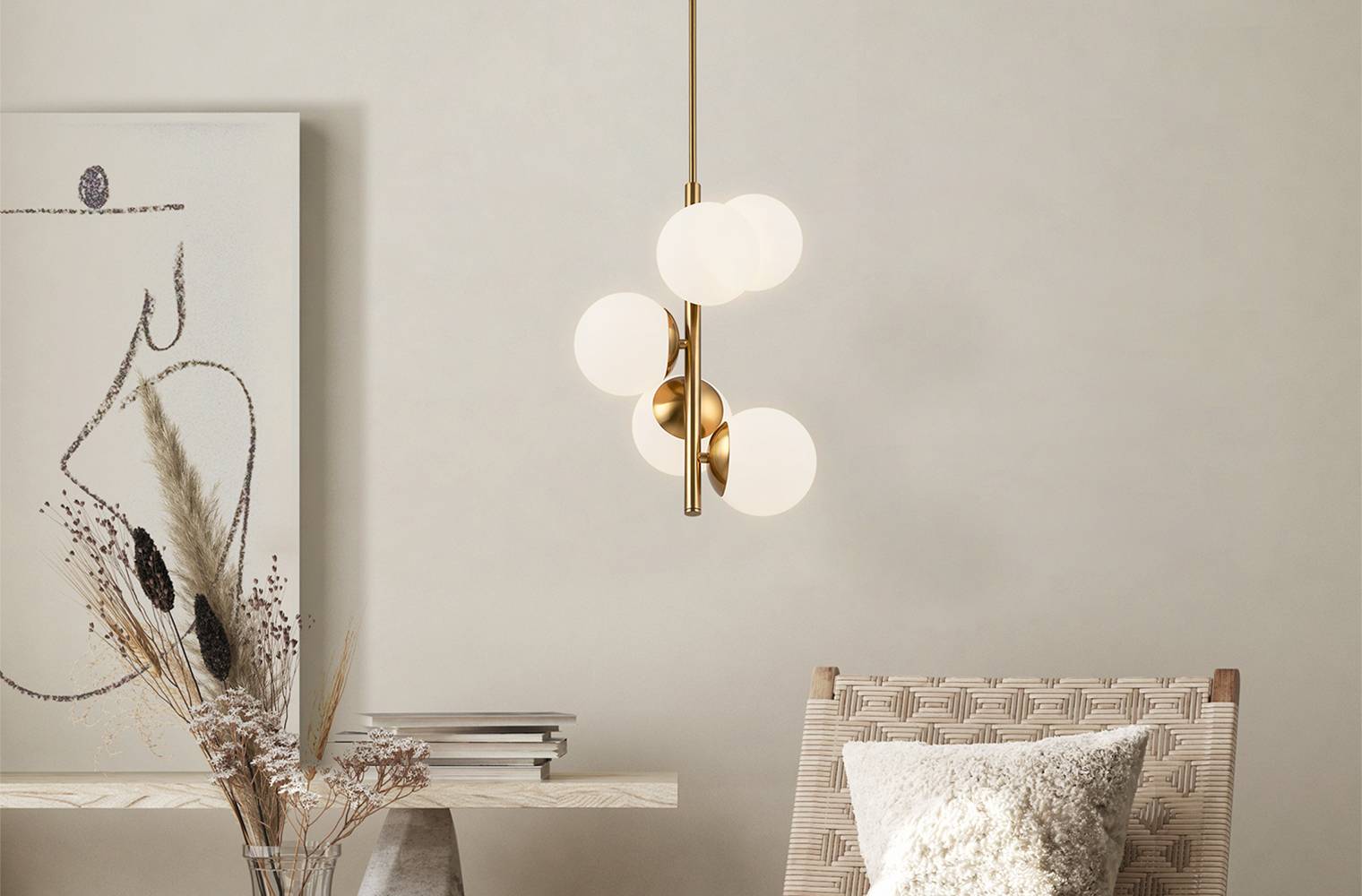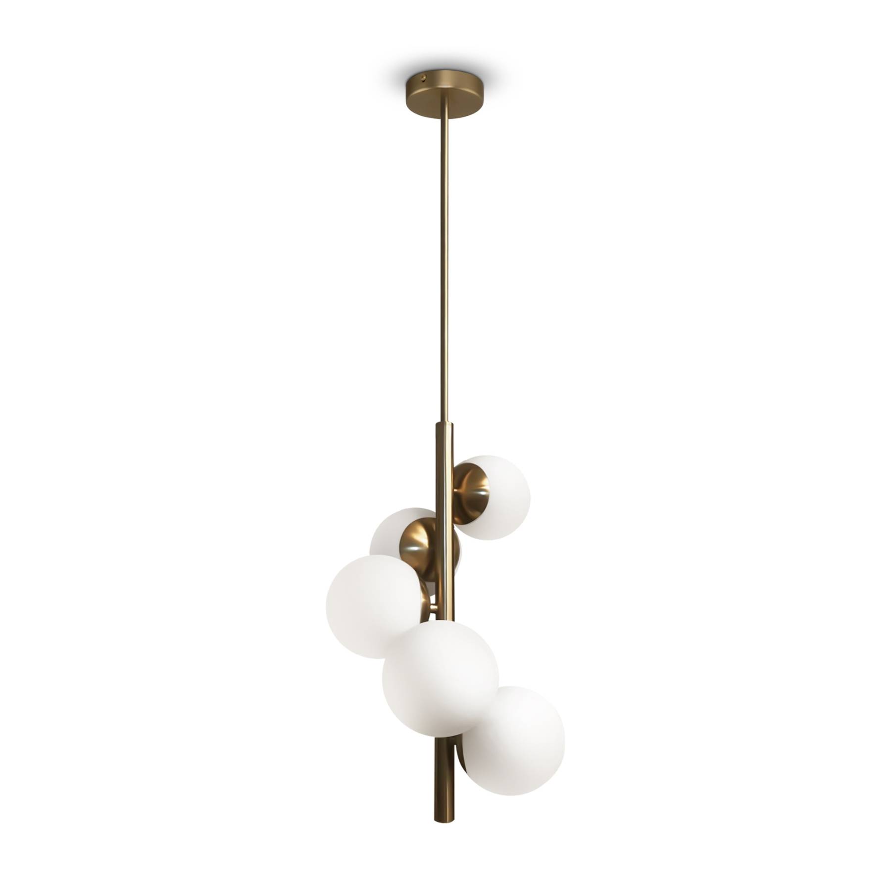 Металлическая арматура. Оттенок – латунь. Плафоны-сферы из матового стекла. Оригинальное конструктивное решение: плафоны размещены на горизонтальной или вертикальной планке. Источник света – лампа с цоколем Е27.