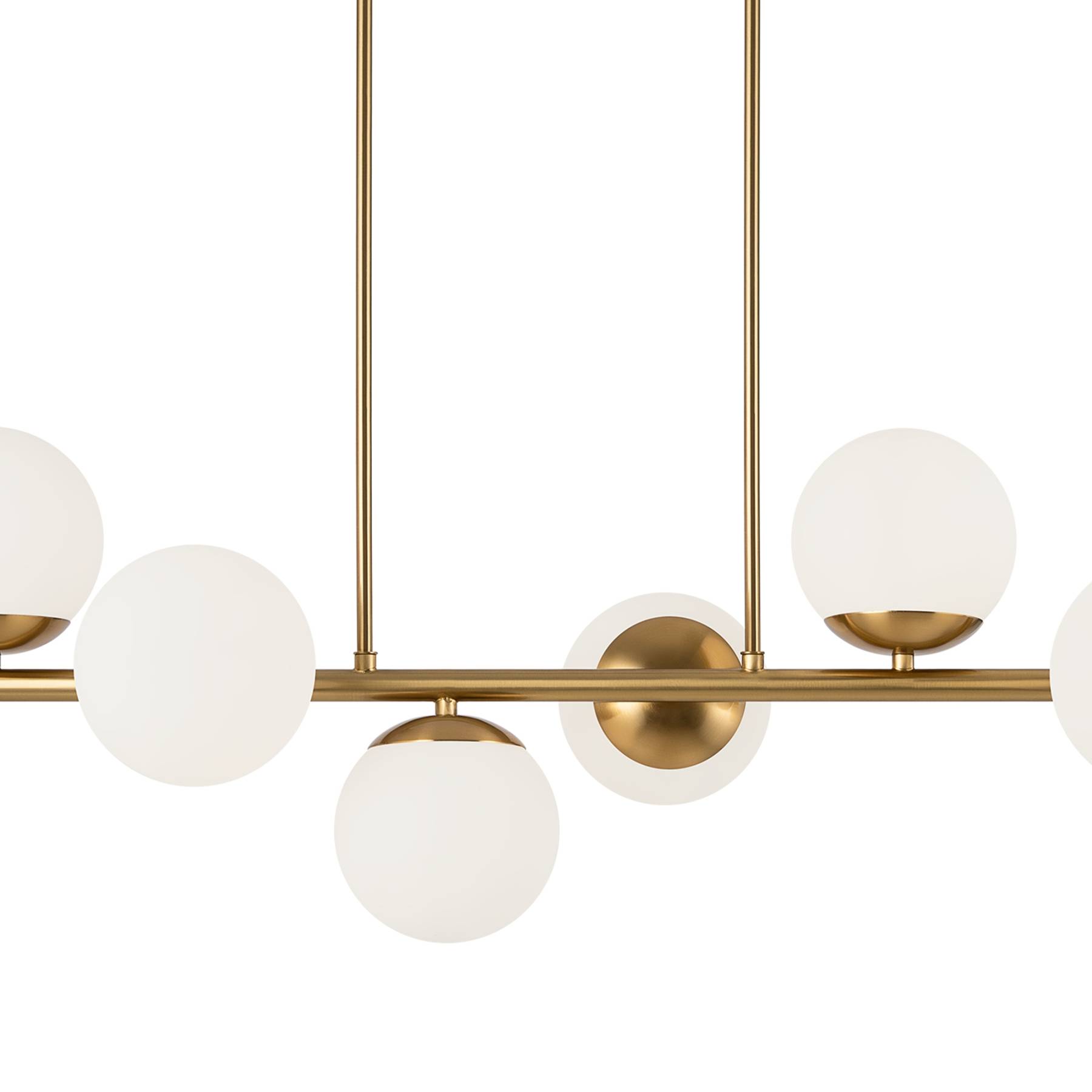 Металлическая арматура. Оттенок – латунь. Плафоны-сферы из матового стекла. Оригинальное конструктивное решение: плафоны размещены на горизонтальной или вертикальной планке. Источник света – лампа с цоколем Е27.