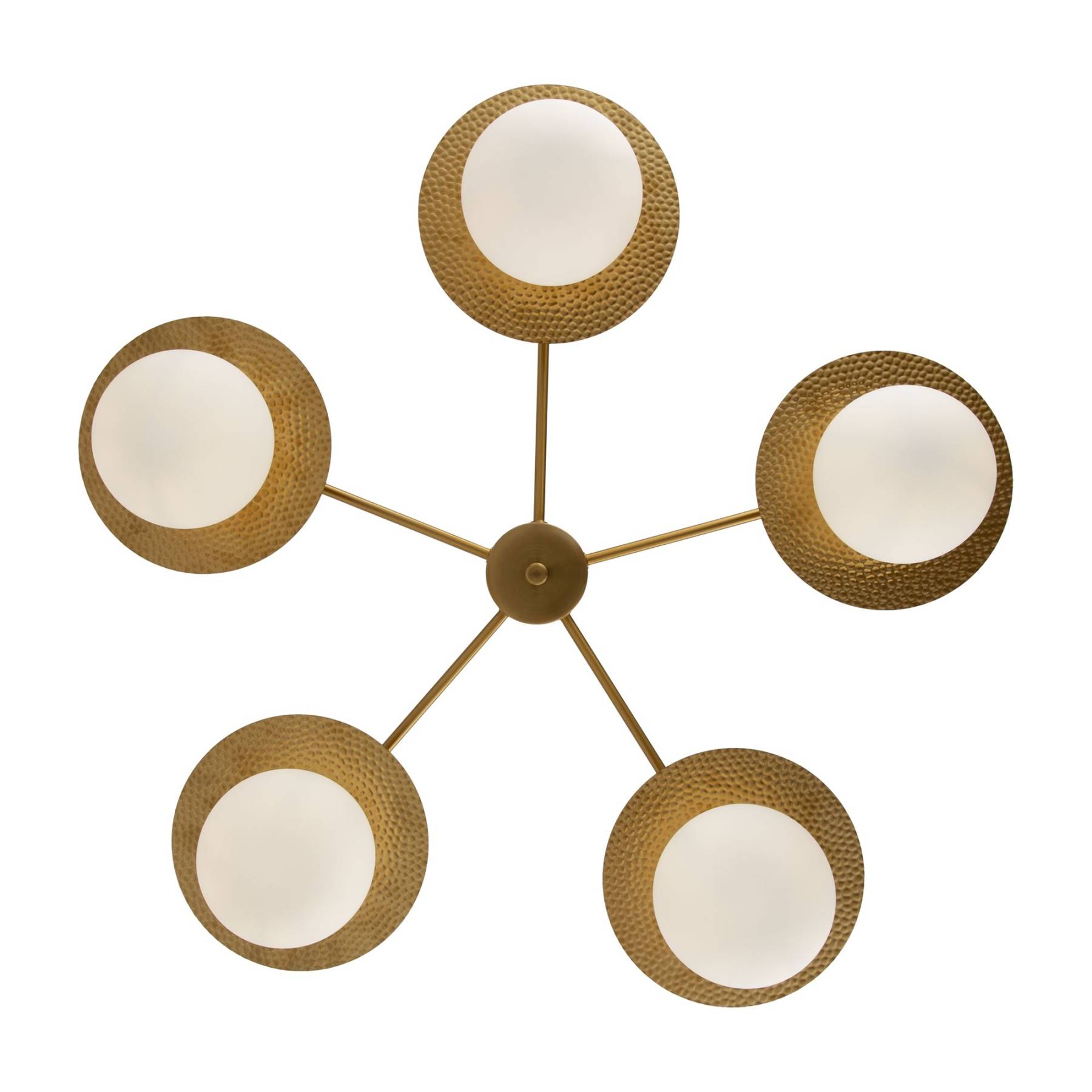 Арматура из металла, цвет – латунь. Плафоны сферической формы из матового белого стекла. Плоские розетки с эффектом чеканки. Трендовый микс фактур. Источник света – лампа с цоколем Е27.