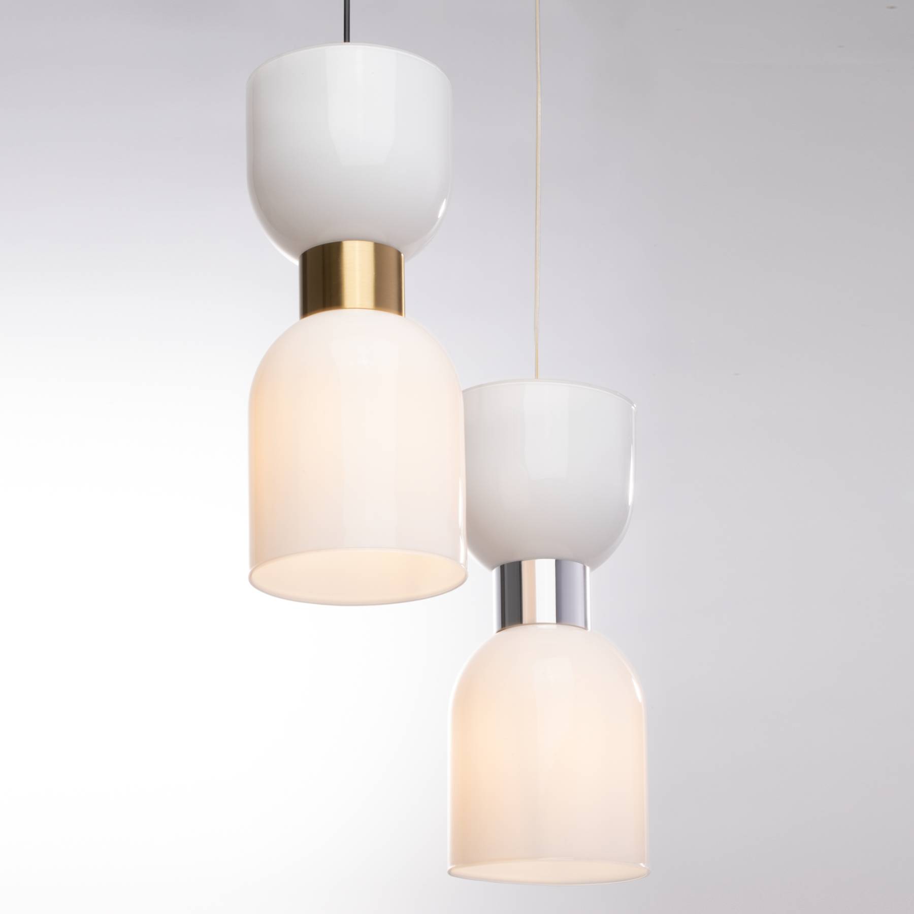 Арматура из металла. Оттенки – хром и латунь. Стеклянные плафоны в двух цветовых решениях: белый глянец и хром с зеркальным эффектом. Оригинальная форма плафонов «песочные часы», двунаправленный световой поток. Широкий ассортимент. Источник света – лампа с цоколем E27.