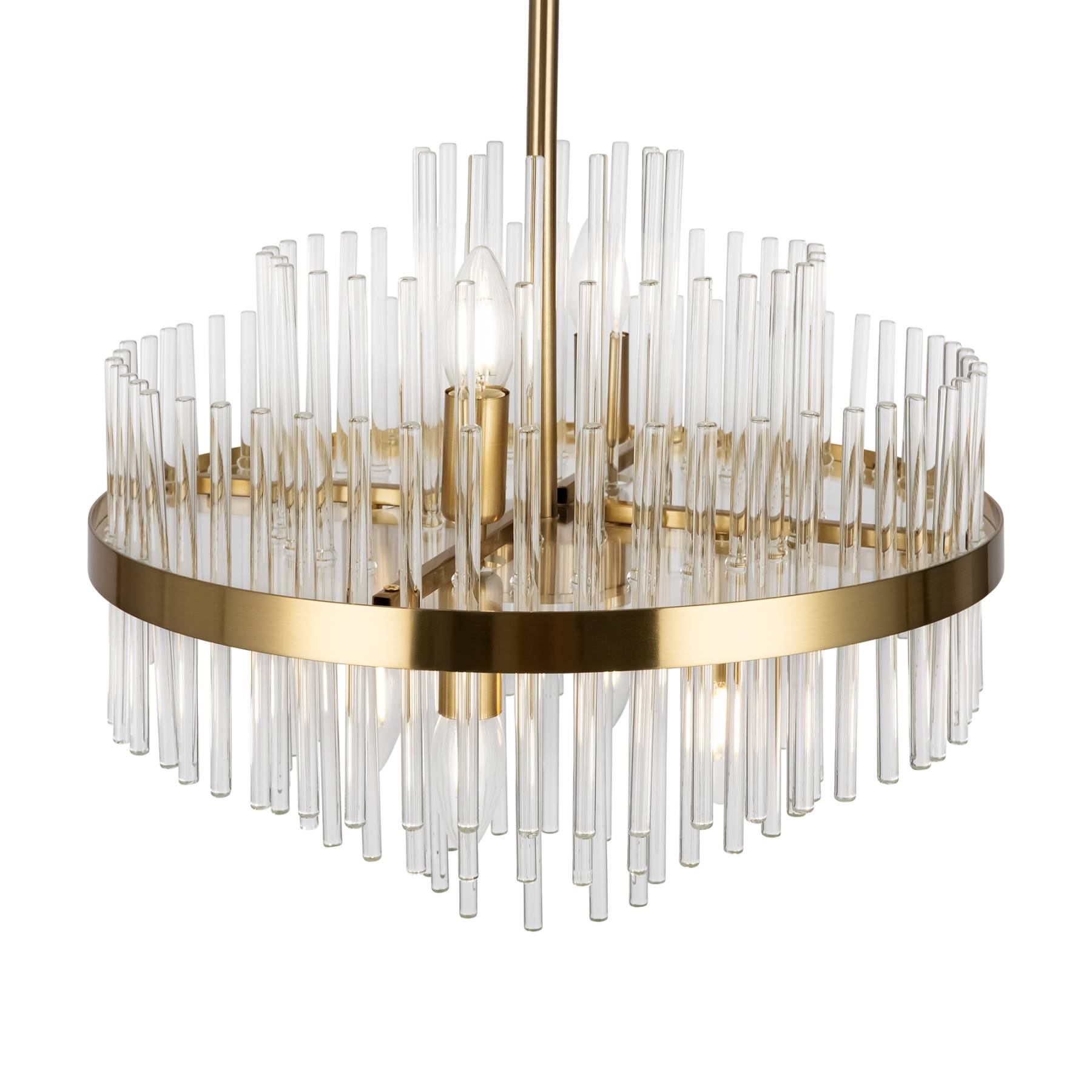 Металлическая арматура, цвет - латунь. Декоративные элементы - прозрачные стеклянные трубки, обрамленные в металлической кольцо в тон арматуре. Источник света - лампа с цоколем Е14.