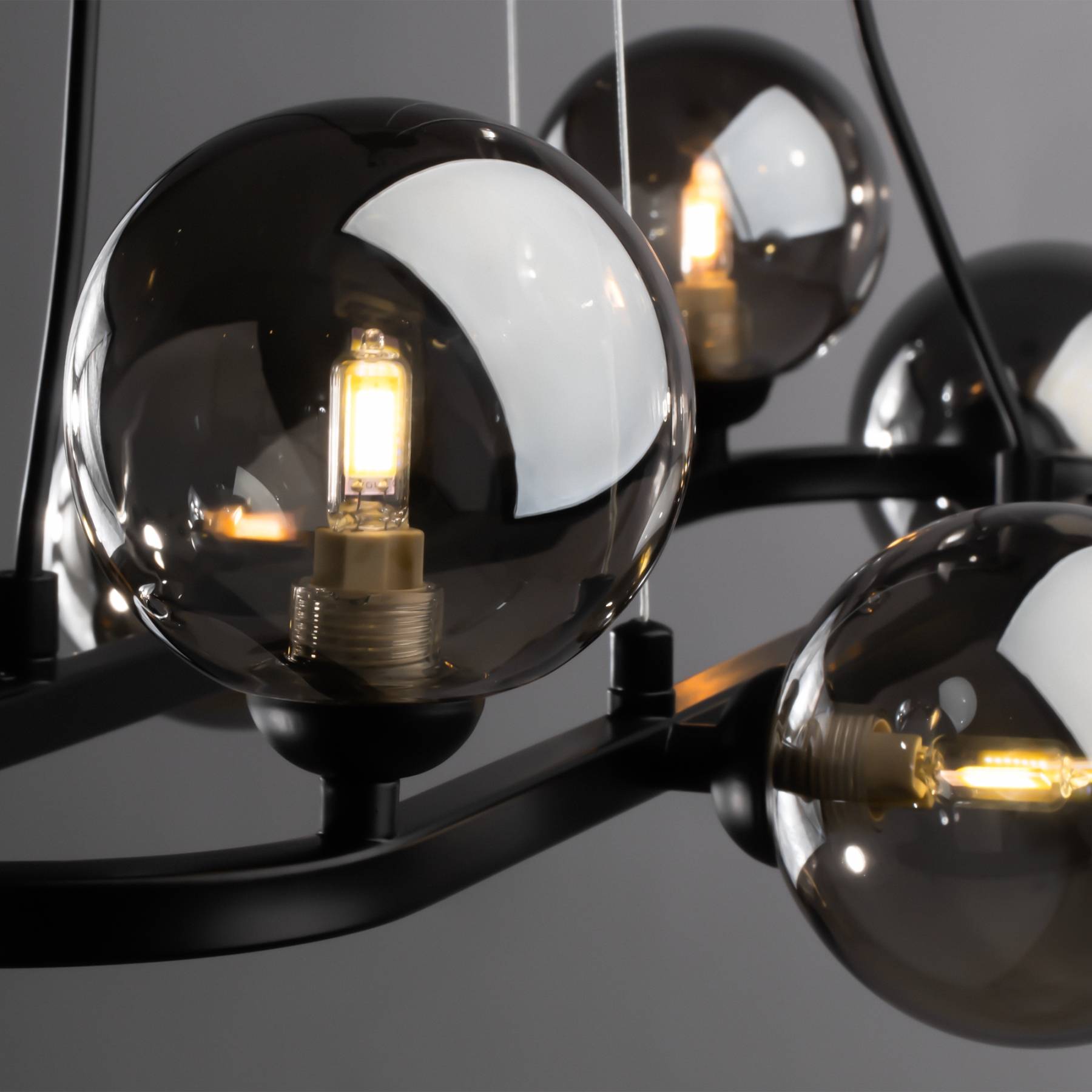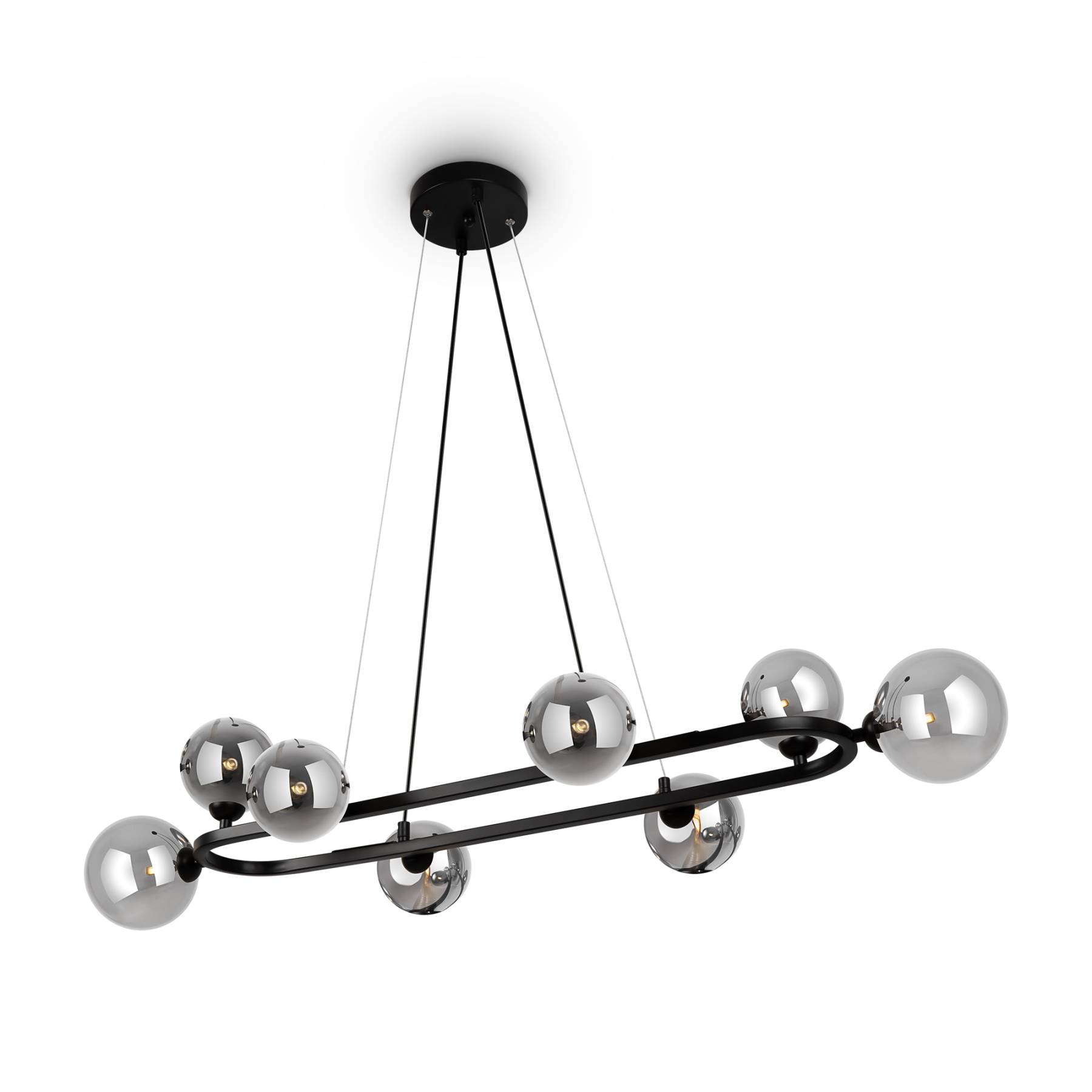 Металлическая арматура, цвета - черный и золотой. Плафоны-сферы из стекла 2х оттенков - матовый белый, полупрозрачный дымчатый - расположены на вытянутом металлическом каркасе, обеспечивая равномерный свет. Тонкие тросы придают светильнику эффект парения. Источник света - лампа с цоколем G9.