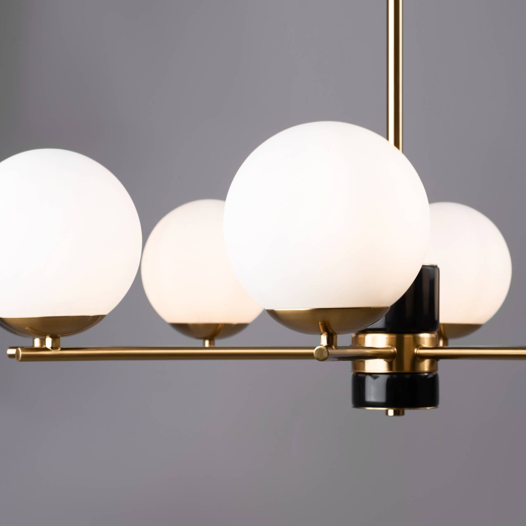 Арматура - металл, цвет - латунь. Мраморные черные элементы в основании. Плафоны-сферы из белого матового стекла с металлической апликацией у основания крепления в цвет арматуры. Сменямый источник света - лампы с цоколем Е27.