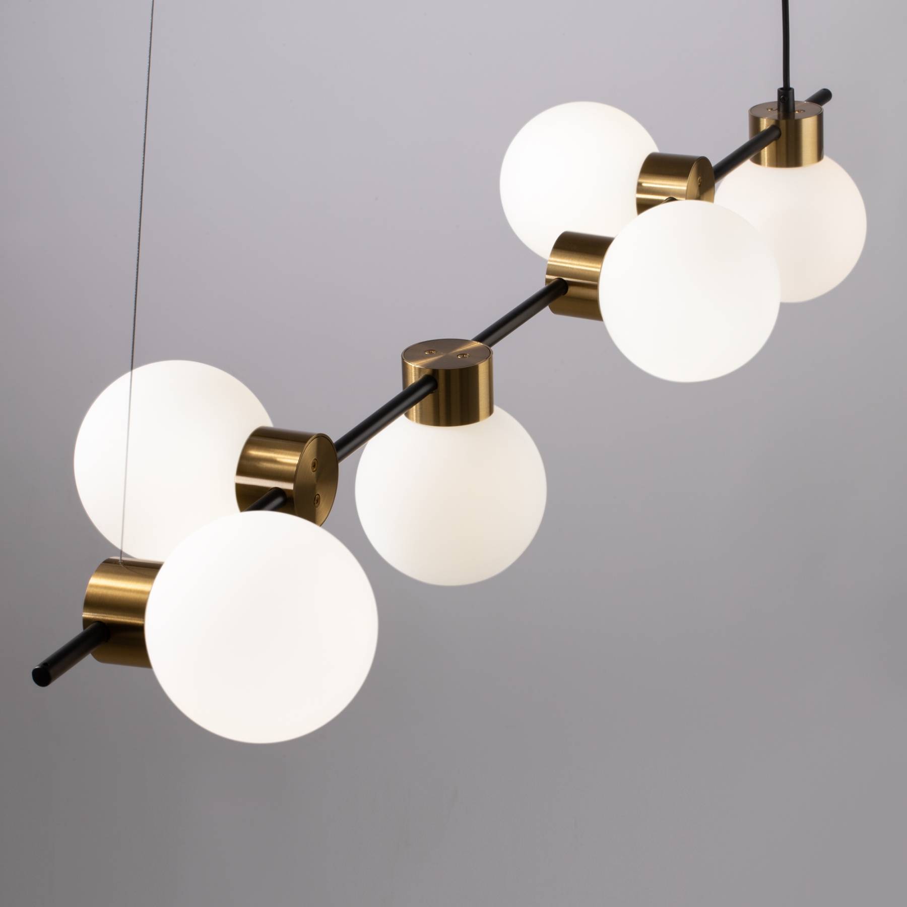 Металлическая арматура, цвет - черный + латунь. Стеклянные плафоны в двух оттенках - матовый белый или дымчатый. Направление плафонов в разные стороны позволяет распределить свет максимально равномерно. Источник светал - лампы с цоколем G9.
