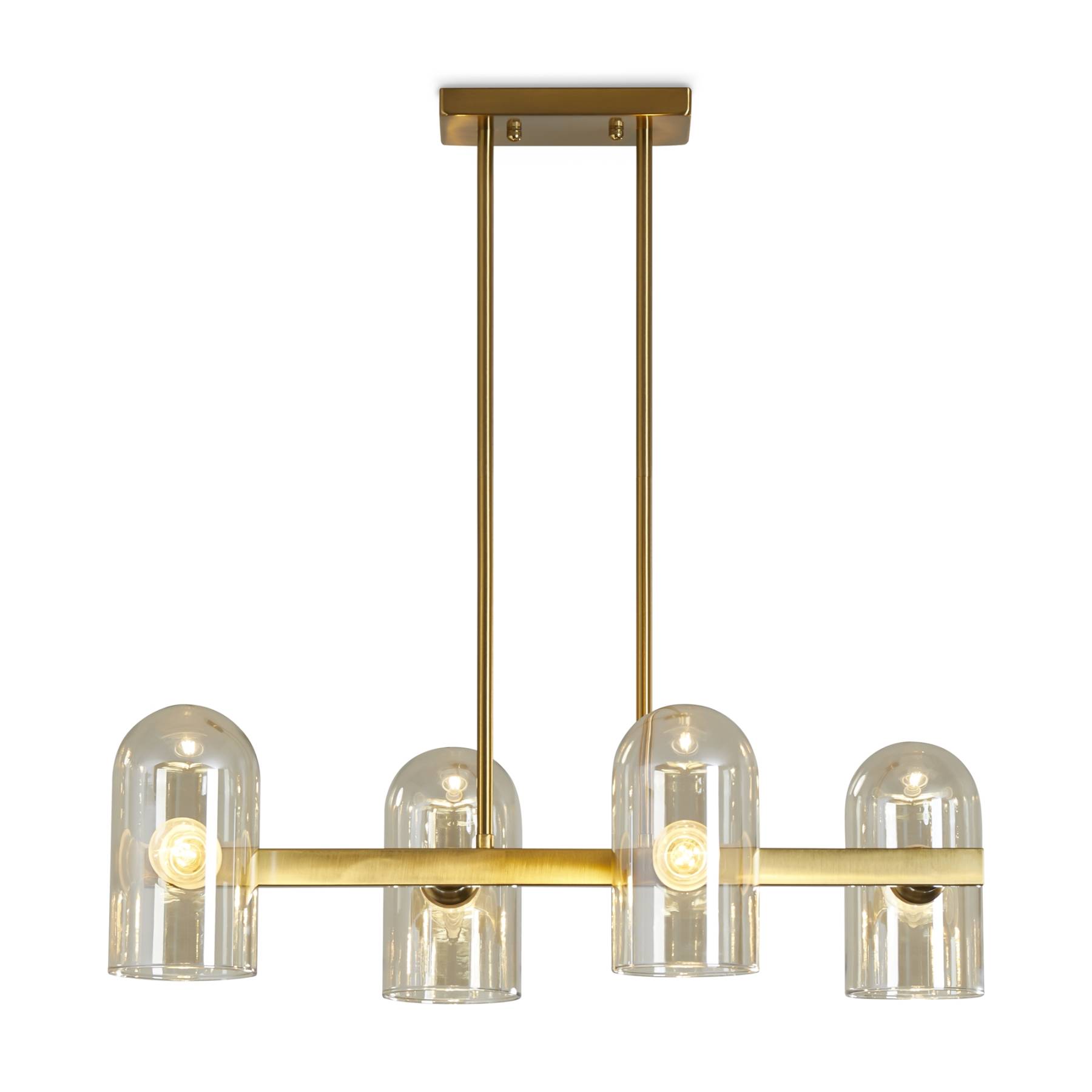 Арматура — металл. Цвет — латунь. Горизонтальные подвесы на твердой ножке. Плафоны из коньячного стекла в форме конуса. Направление плафона у настенного светильника можно регулировать за металлическое основание. Источник света лампа. Цоколь E14.