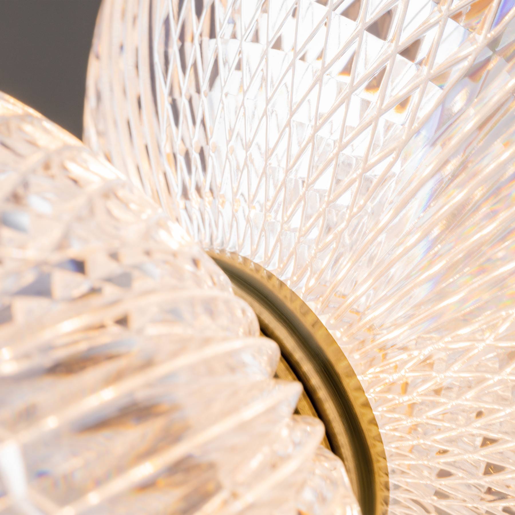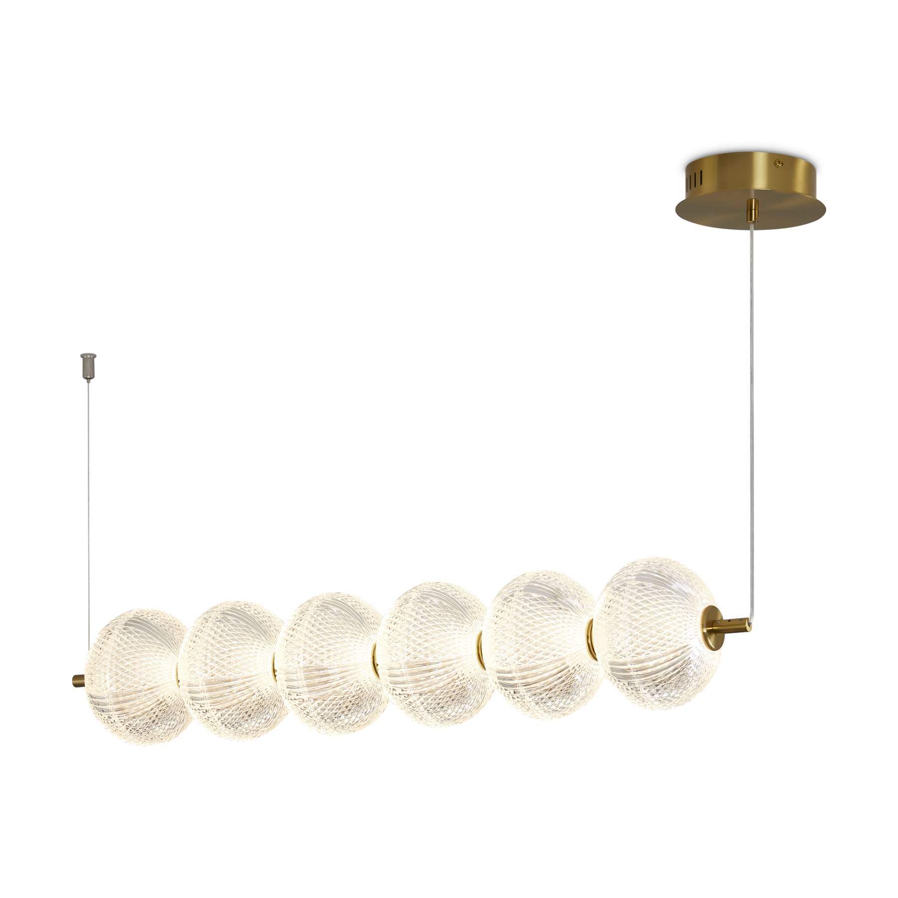Арматура выполнена из металла в цвете латунь. Прозрачные плафоны. Вертикальные и горизонтальные подвесные светильники разных размеров. LED источник света. Цветовая температура 3000К.