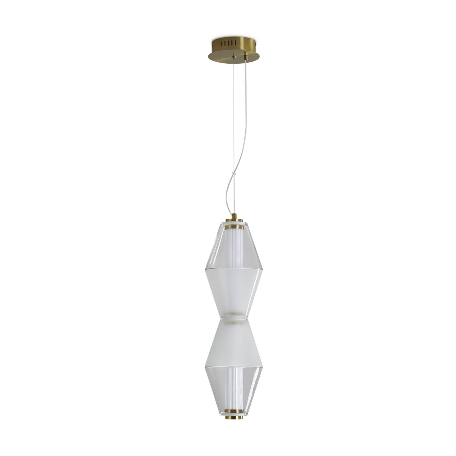 Арматура из металла. Цвет латунь. Плафон из матового, кристально прозрачного и дымчатого стекла. Горизонтальные и вертикальные подвесы. LED источник света. Цветовая температура 3000К.