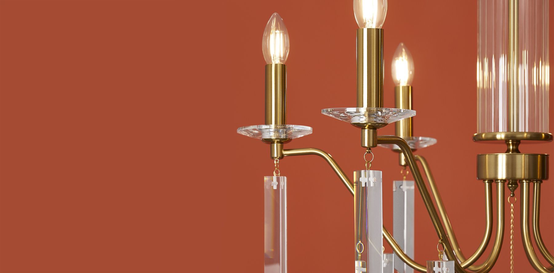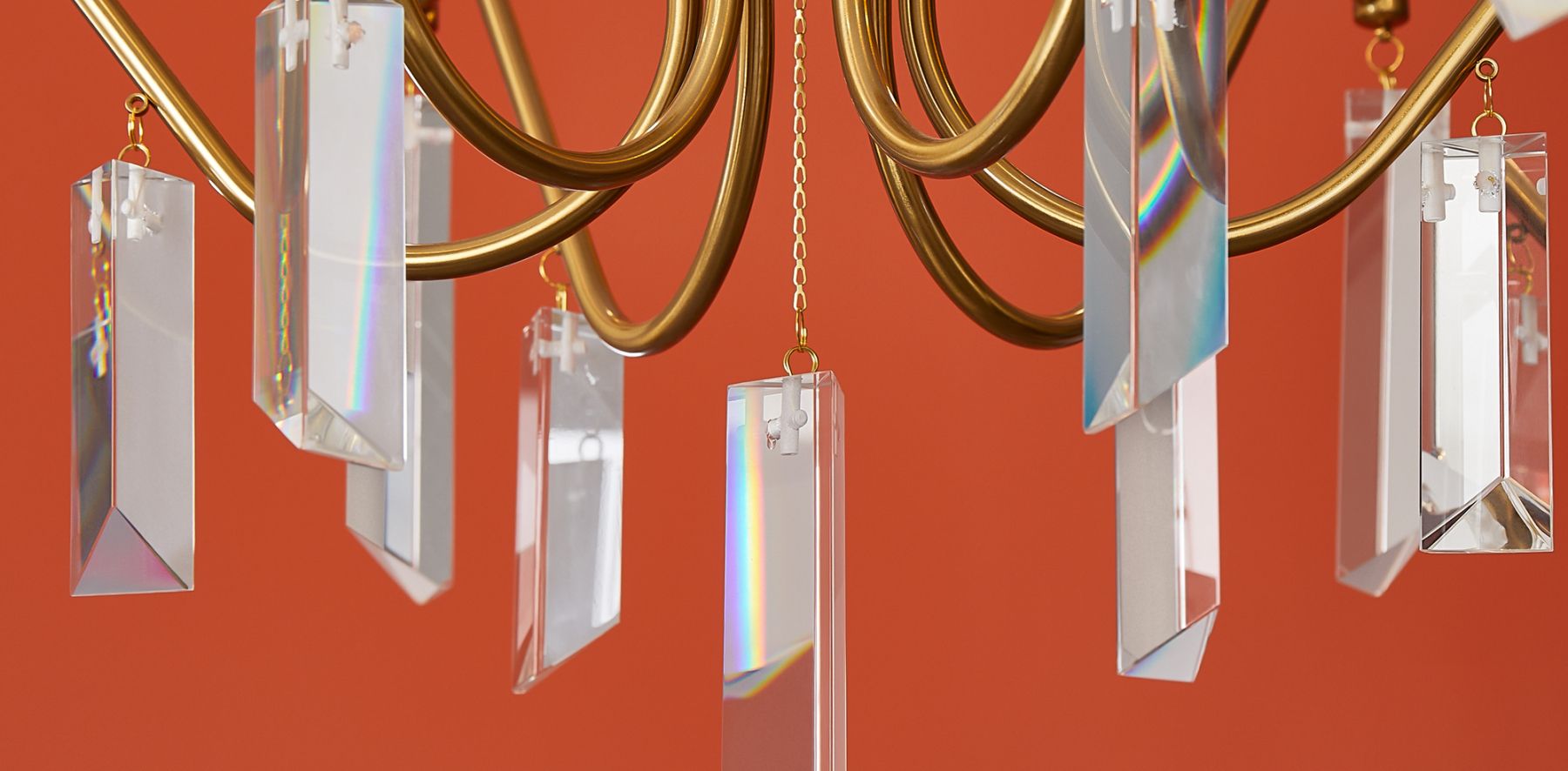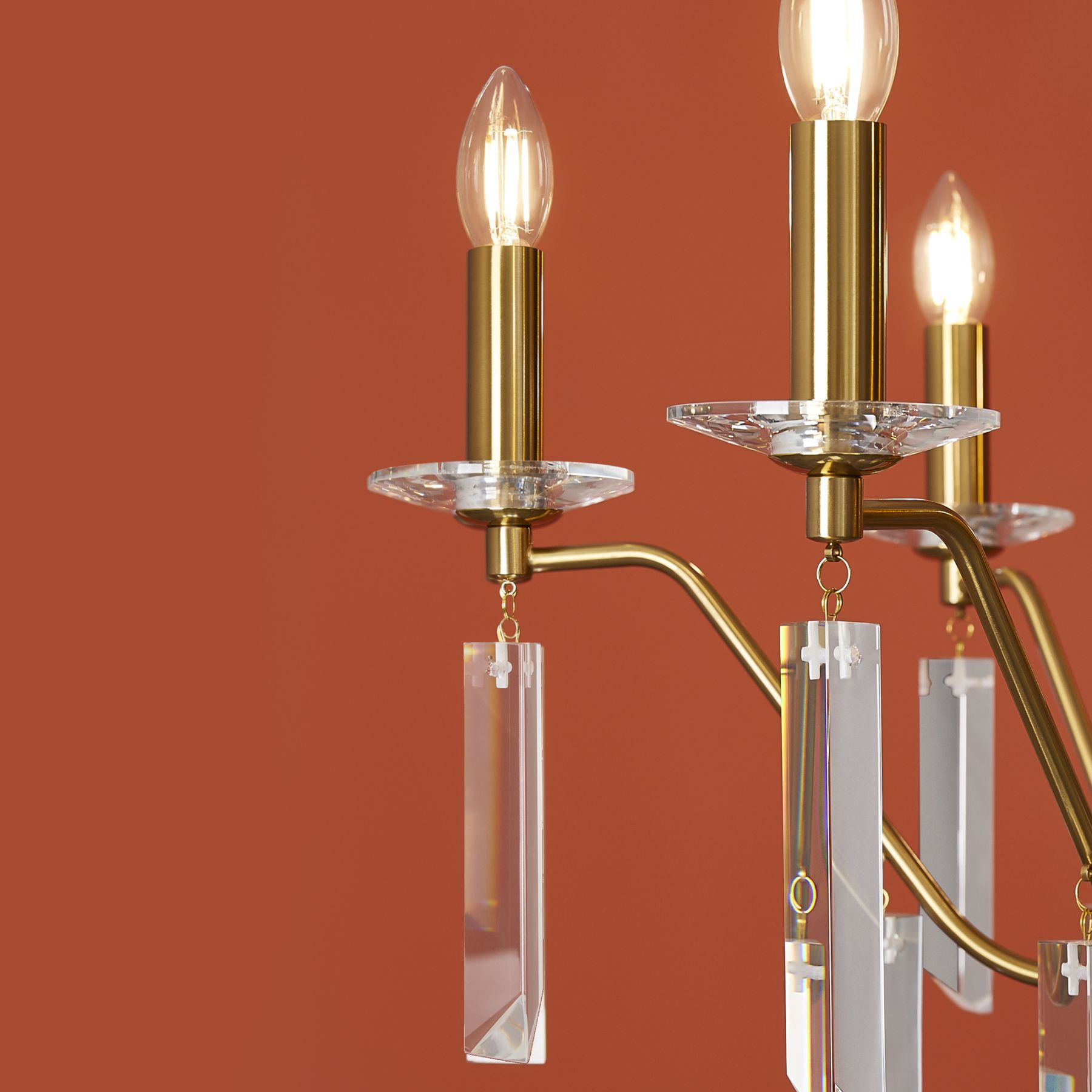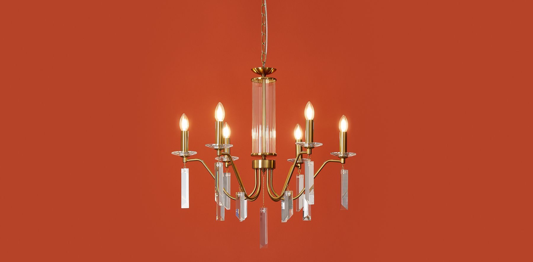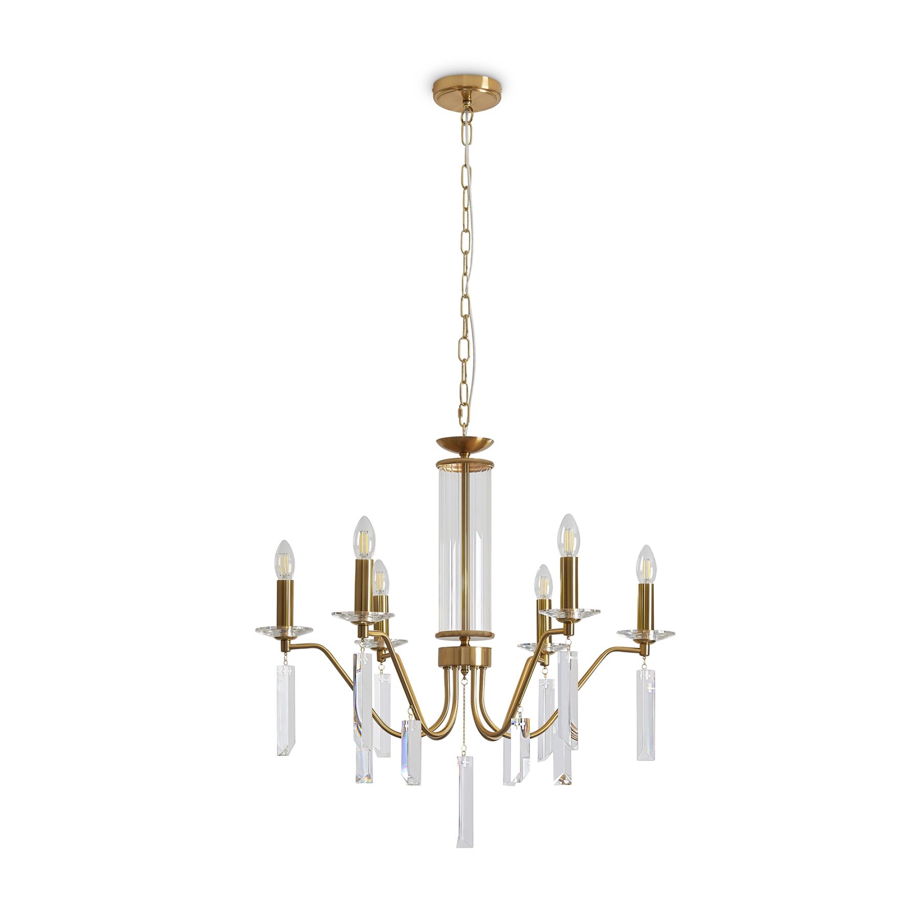 Материал арматуры — металл, цвет — никель или латунь. Подвесные светильники с цоколем E14. Доступны с пятью или шестью источниками света. Грани хрустальных подвесов создают эффект перелива радуги. Центральный декор из стеклянных трубок. Подходит для классических интерьеров.