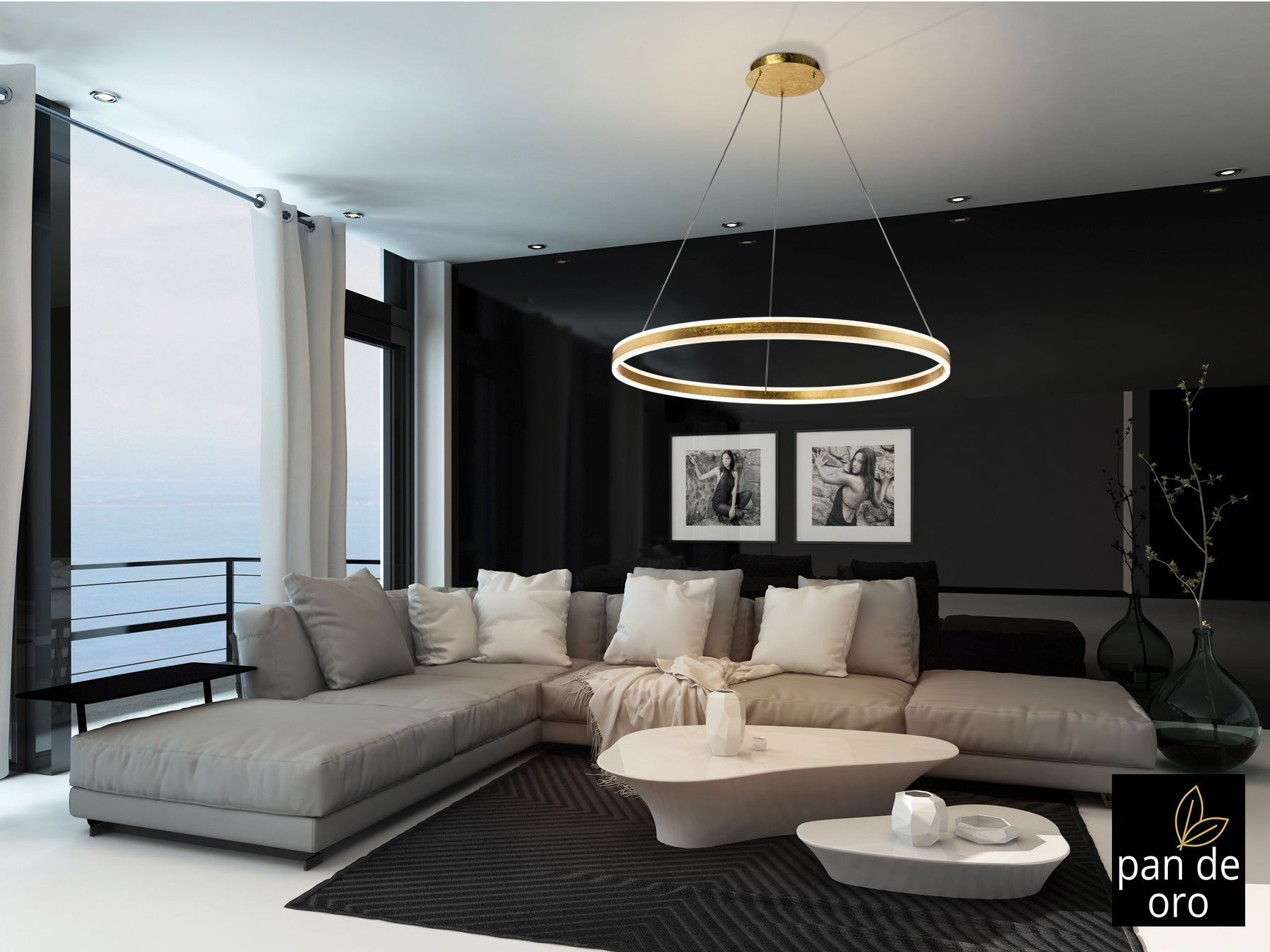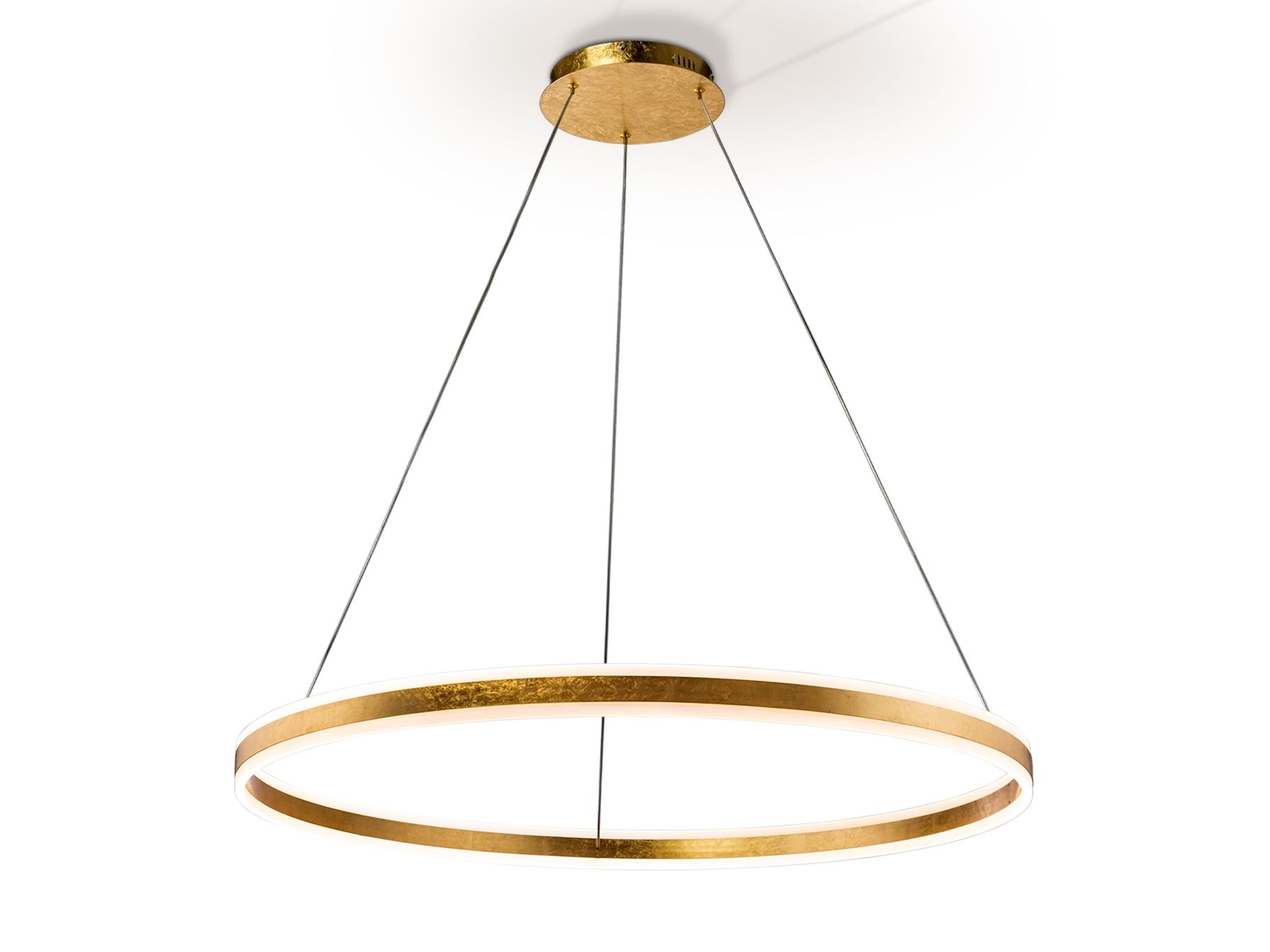 Подвесной светильник из металла и алюминия, покрытие из ЗОЛОТОЙ фольги. Обруч с акриловым рассеивателем опалового цвета. С регулируемой высотой. 110W LED, 6600 Lm, 3000 K.