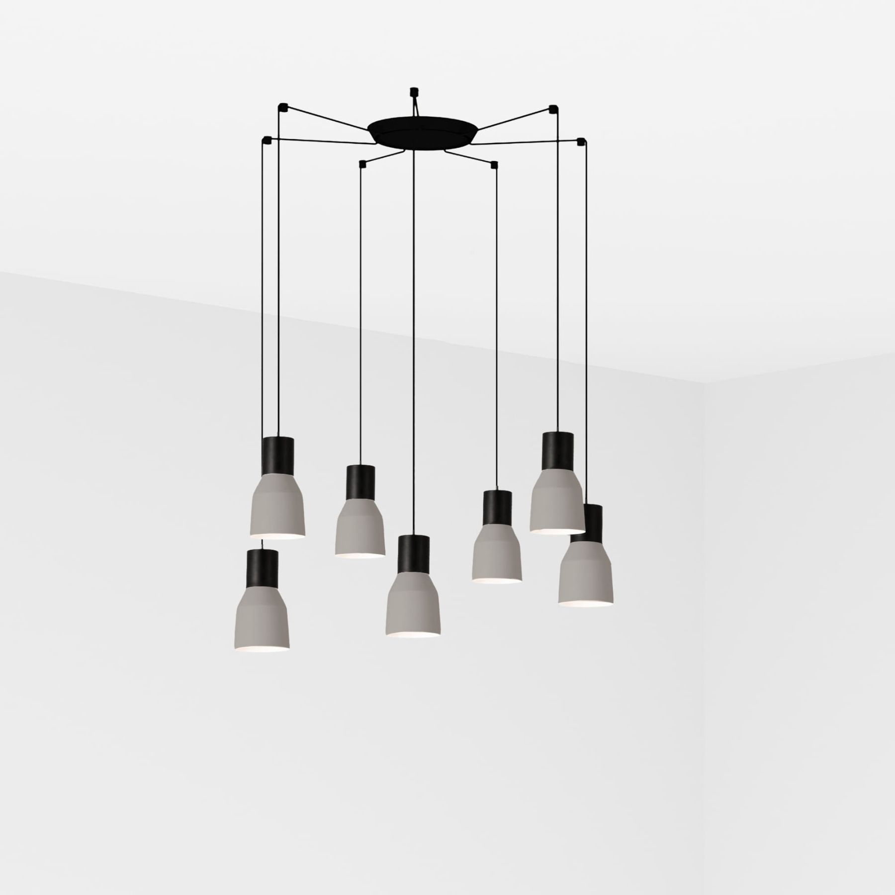 KOMBO — это семейство подвесных светильников, созданное Nutcreatives. Серия имеет разные размеры и отделку, которые имеют черную цилиндрическую структуру в верхней части. Абажур этого серого света выполнен из металла, выполнен в стиле минимализма и играет с геометрическими формами. Версия с многократным 7-световым фонарем.