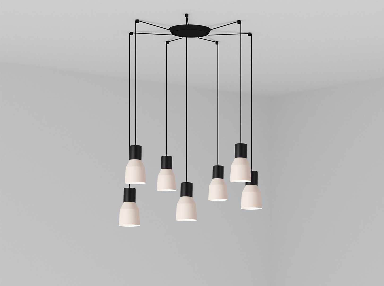 KOMBO — это семейство подвесных светильников, созданное Nutcreatives. Серия имеет разные размеры и отделку, которые имеют черную цилиндрическую структуру в верхней части. Абажур этого бежевого светильника выполнен из металла, выполнен в стиле минимализма и играет с геометрическими формами. Версия с многократным 7-световым фонарем.