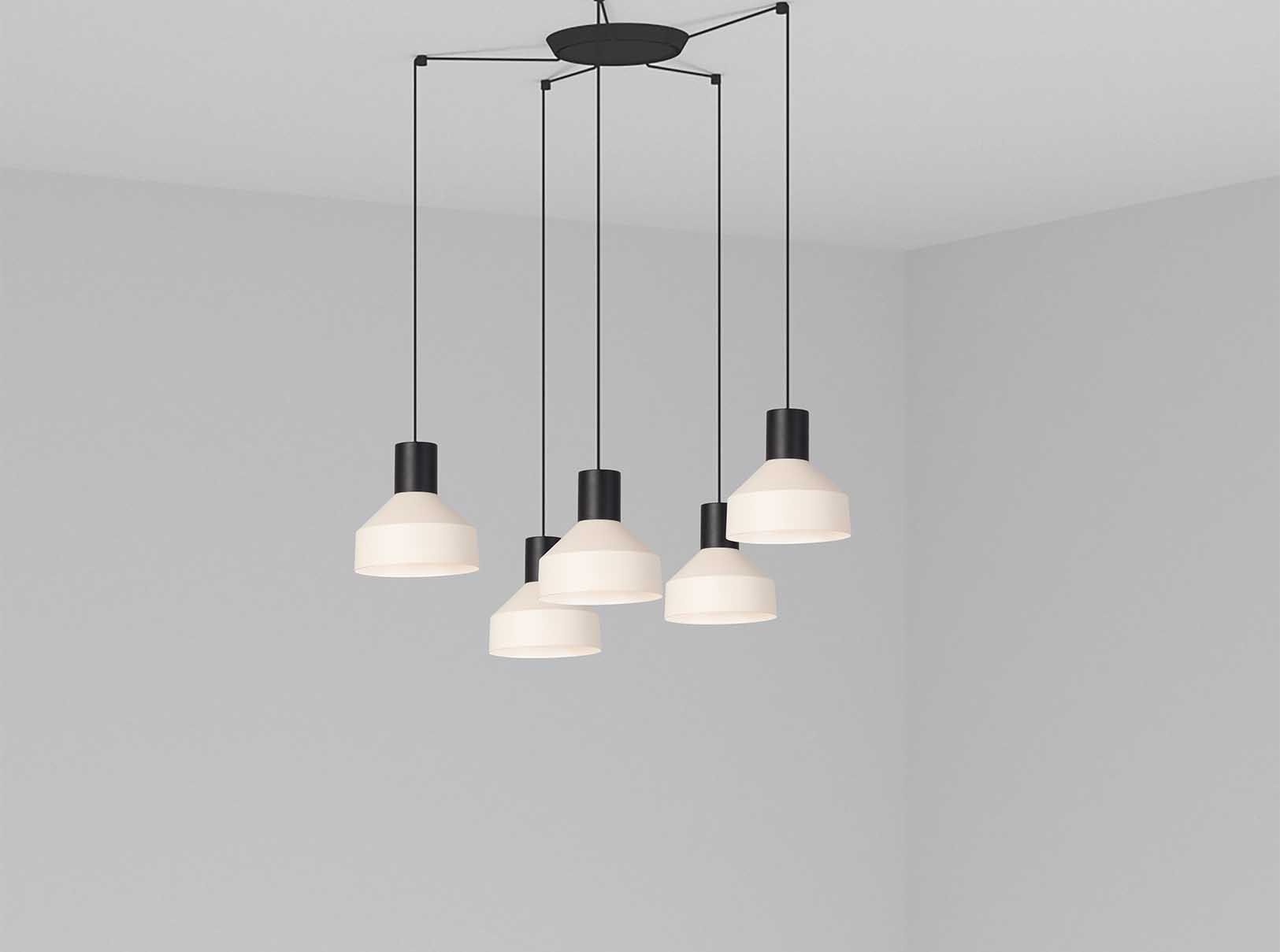 KOMBO — это семейство подвесных светильников, созданное Nutcreatives. Серия имеет разные размеры и отделку, которые имеют черную цилиндрическую структуру в верхней части. Абажур этого бежевого светильника выполнен из металла, выполнен в стиле минимализма и играет с геометрическими формами. Версия с многократным 5-световым фонарем. Его диаметр составляет 20 см.