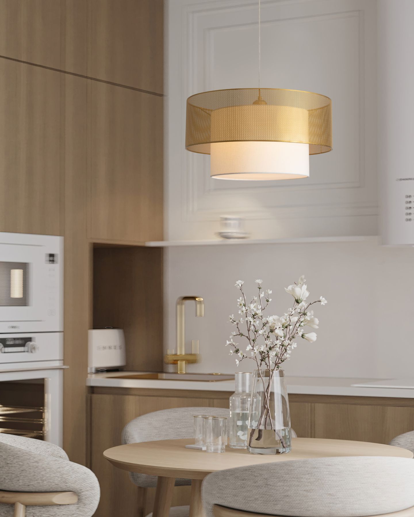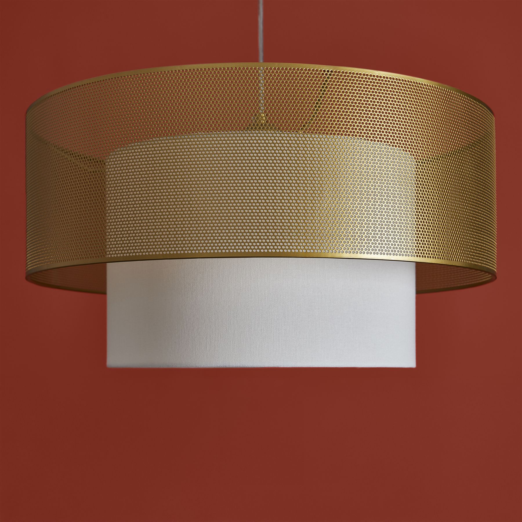 Материал арматуры — металл, цвет — золото под покраску с перфорированным декором-ободком. Подвесной светильник с цоколем E27. Двухслойный абажур: внешний слой — перфорированный металл, внутренний — гладкая белая ткань. Универсален для различных интерьеров.