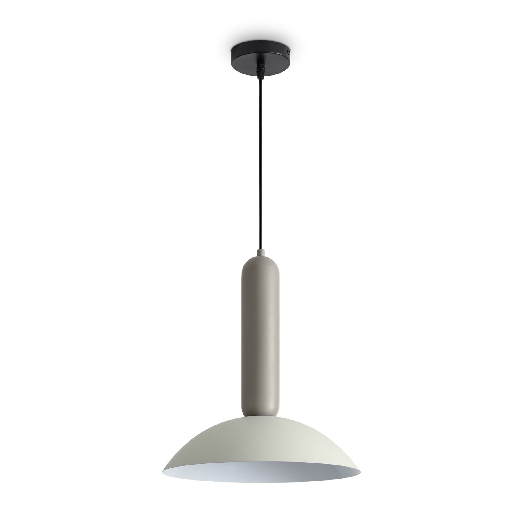 Материал арматуры — металл, цвет — черный. Каждый подвеской светильник окрашен в 2 цвета: серо-бежевый (RAL 1019 ) и жемчужно-белый (RAL 1013), Каменно-серый (7030) и Белый (9010), Белый (9010) и Каменно-серый (7030). Необычный плафон-купол небольшой высоты дополнен подвесом цилиндрической формы. Подходит для современных интерьеров: лофт, джапанди и минимализм. Номер Ral носит рекомендательный характер.