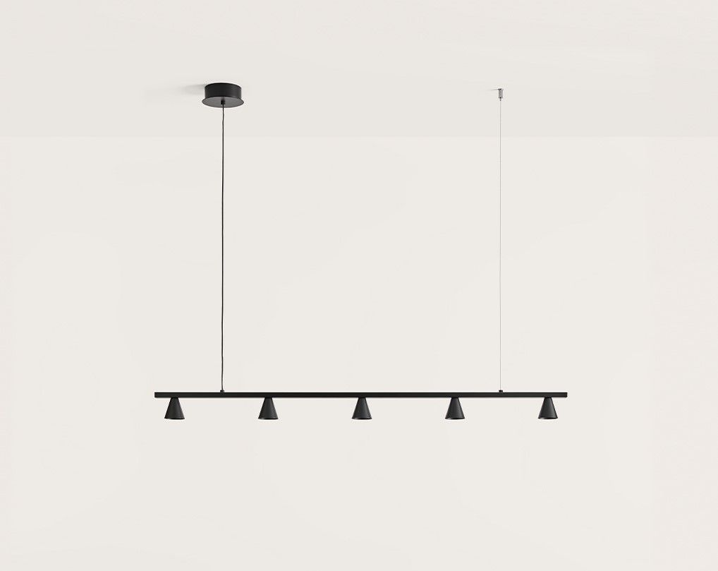 Подвесной светильник Lyb с пятиконечной светодиодной подсветкой. Каждый светильник направлен вниз и прикреплен к металлической конструкции, доступной в золотом или черном цвете.