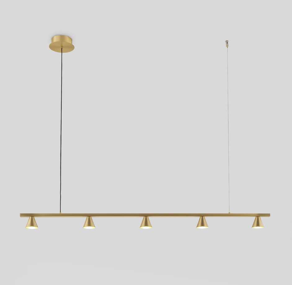 Подвесной светильник Lyb с пятиконечной светодиодной подсветкой. Каждый светильник направлен вниз и прикреплен к металлической конструкции, доступной в золотом или черном цвете.