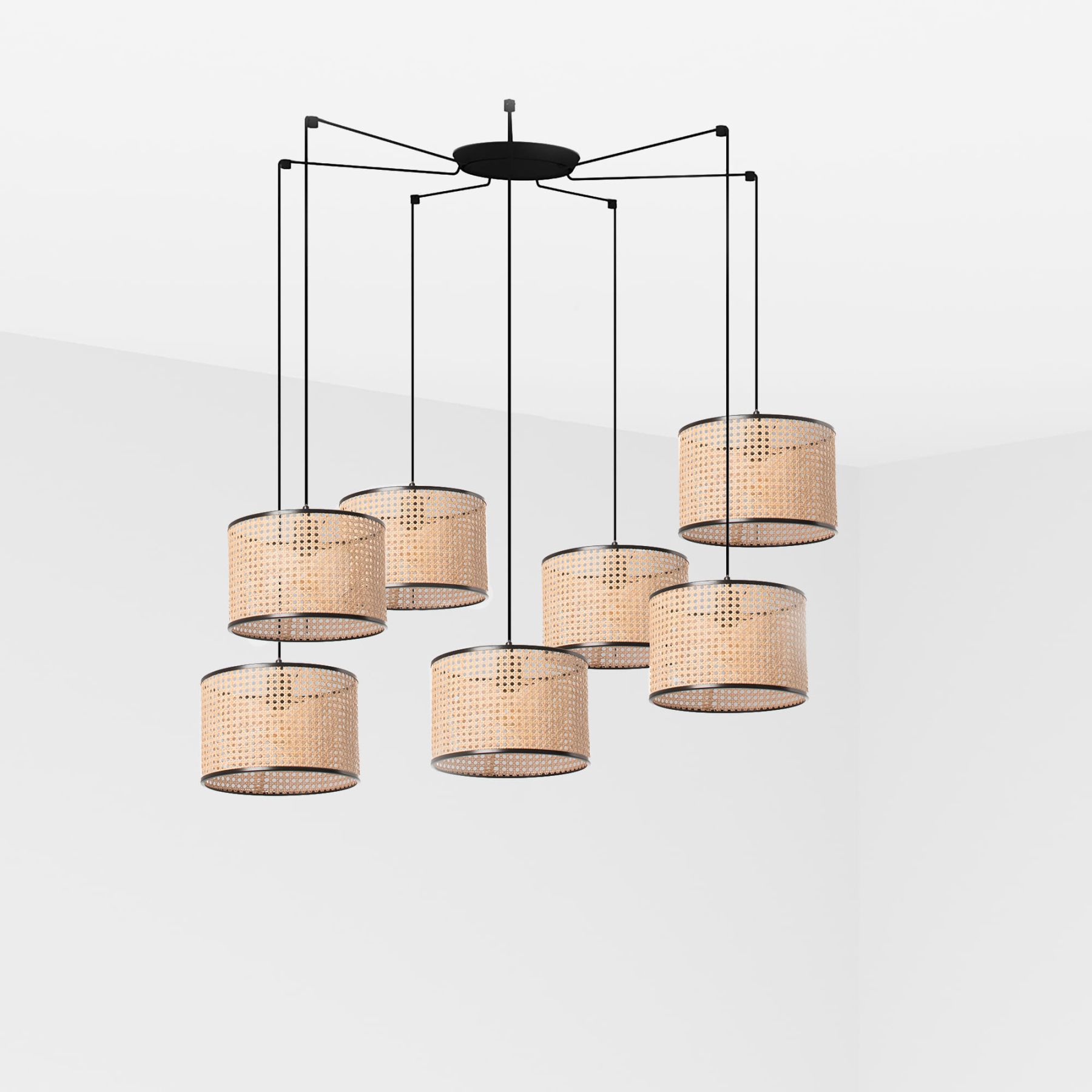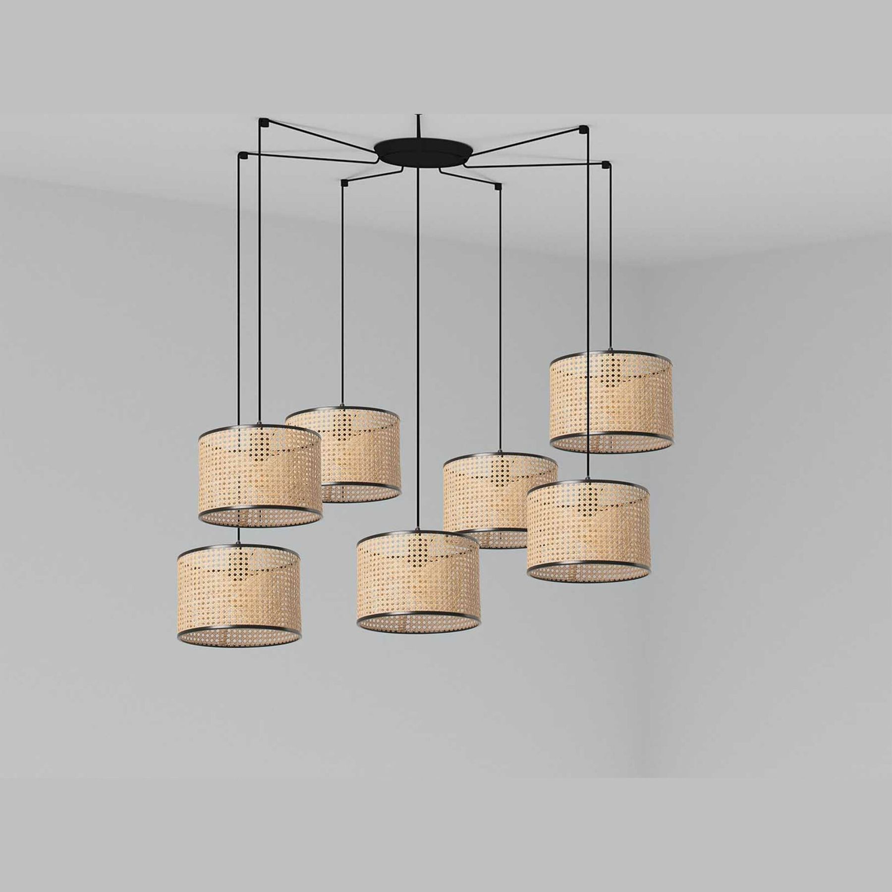 Версия с многократным 7-световым фонарем. MAMBO — это коллекция ламп для внутреннего освещения, разработанная Faro Lab. Этот черный настенный светильник с абажуром из ротанга предназначен для освещения спален и гостиных. Кабель имеет талреп, что позволяет использовать светильник в смещенных точках. Это хороший выбор для отелей. Абажур версии 320 мм.