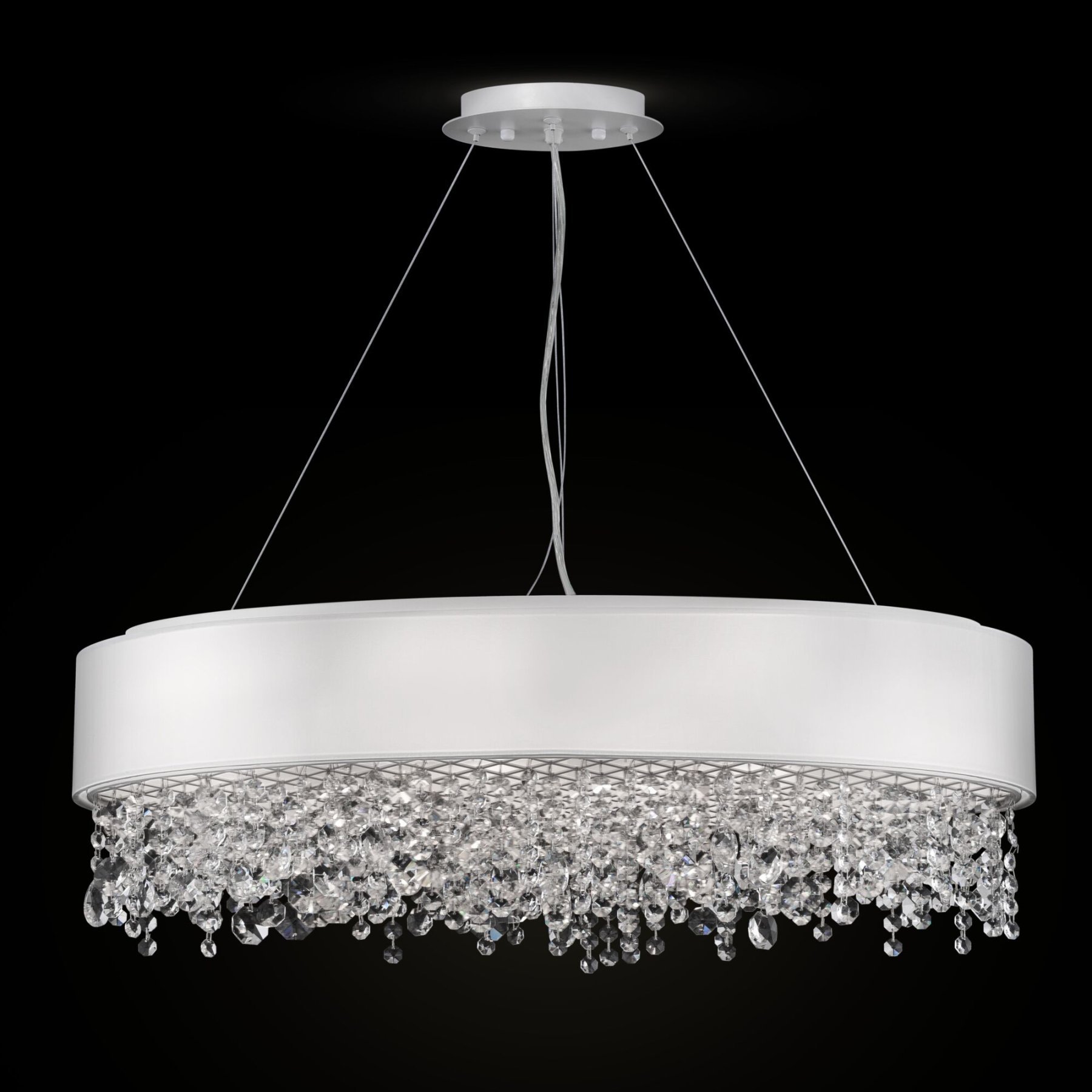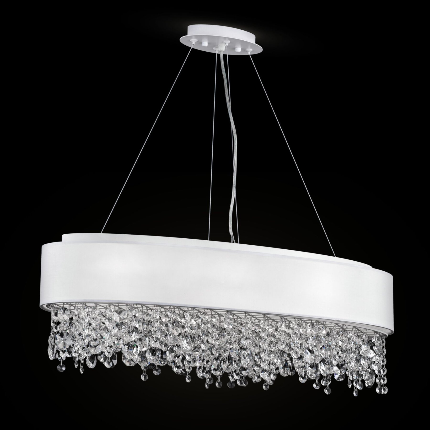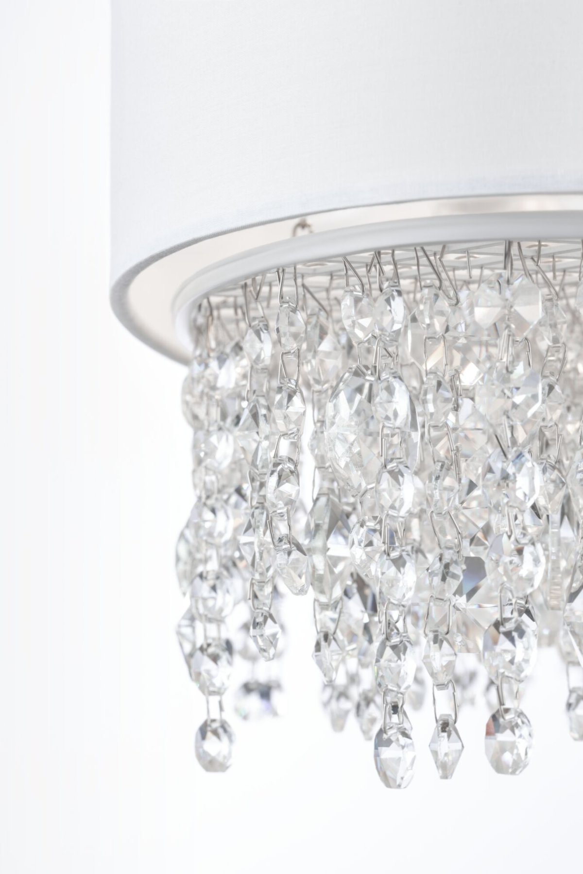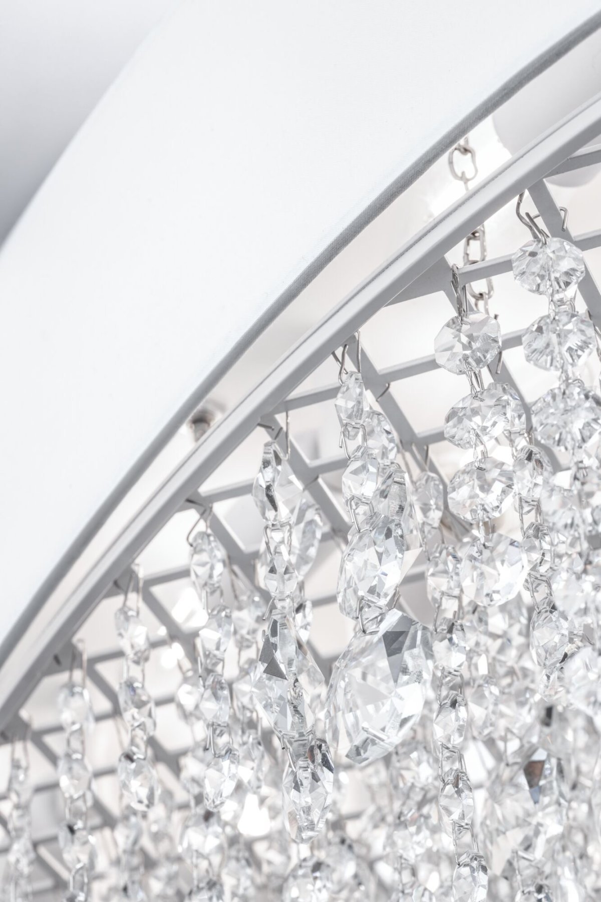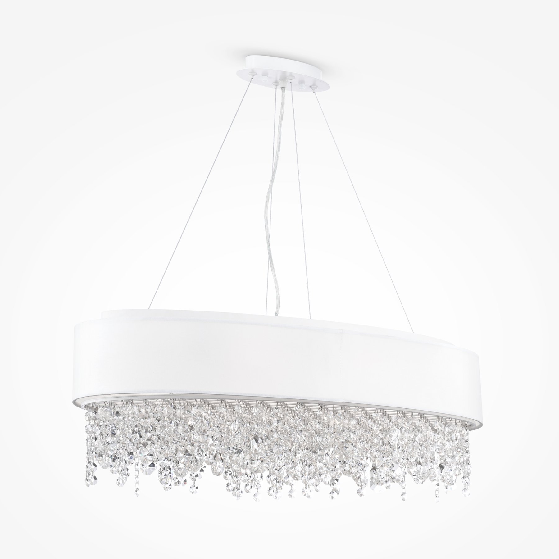 Металлическая арматура в белом цвете. Абажур – ткань, нанесенная на ПВХ, цвет – белый. Декор – подвески в виде граненых кристаллов. Высота подвесных светильников регулируется тросом.